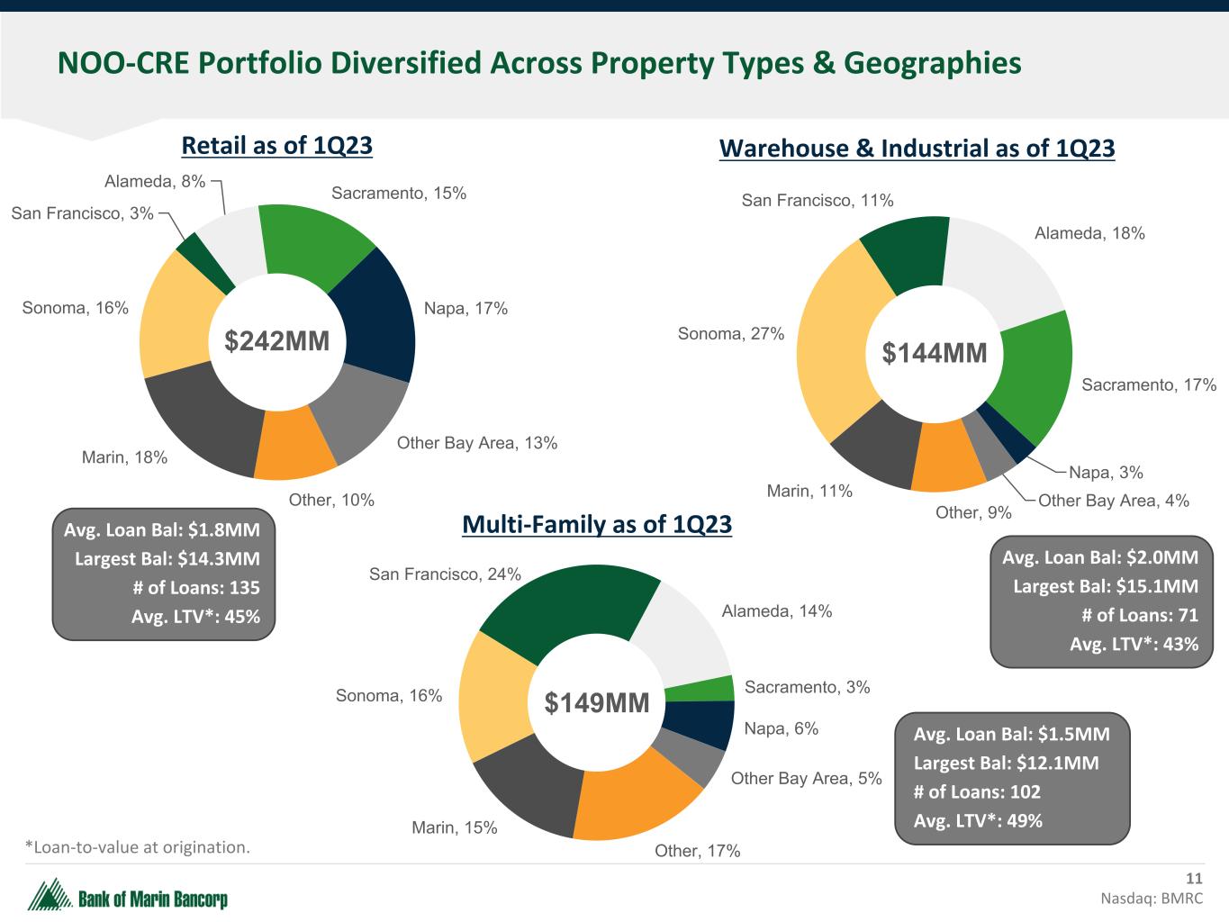 Non-owner Occupied Office Exposure As of 3/31/23 10 Nasdaq: BMRC • $370 million in exposure spread across our 10-county footprint comprised of 144 loans • $2.6 million average loan balance – largest loan at $17.2 million • 55% average loan-to-value and average debt-service coverage ratio of 1.67x* • City of San Francisco NOO-CRE office exposure is 3% of total loan portfolio and 6% of total NOO-CRE loans Marin, 26% Sonoma, 14% San Francisco, 19% Alameda, 7% Sacramento, 6% Napa, 10% Other Bay Area, 14% Other, 4% NOO-CRE Office Portfolio by County City of S.F. NOO-CRE Office Portfolio Total Balance: $71.7 million Average Loan Bal: $6.5 million Number of Loans: 11 loans Average LTV*: 60% Average DCR: 1.20x Average Occupancy: 85% 10 of the 11 properties are low rise buildings, the other is 10 stories. $370MM *At most recent measurement.