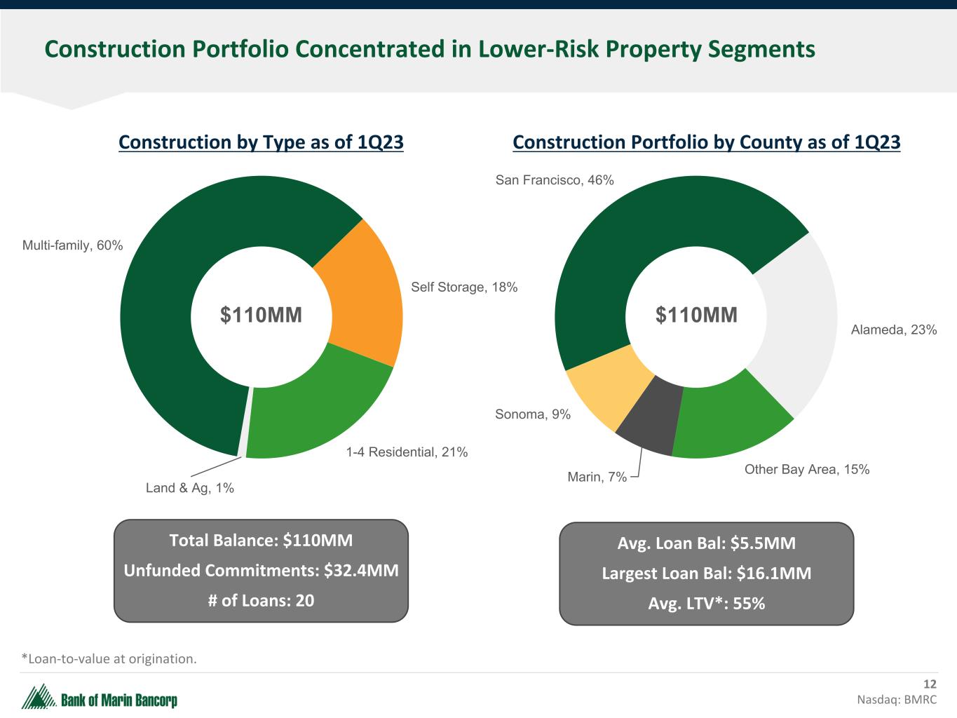 NOO-CRE Portfolio Diversified Across Property Types & Geographies 11 Nasdaq: BMRC Retail as of 1Q23 Warehouse & Industrial as of 1Q23 Multi-Family as of 1Q23 Marin, 18% Sonoma, 16% San Francisco, 3% Alameda, 8% Sacramento, 15% Napa, 17% Other Bay Area, 13% Other, 10% Marin, 15% Sonoma, 16% San Francisco, 24% Alameda, 14% Sacramento, 3% Napa, 6% Other Bay Area, 5% Other, 17% Marin, 11% Sonoma, 27% San Francisco, 11% Alameda, 18% Sacramento, 17% Napa, 3% Other Bay Area, 4% Other, 9% $242MM $149MM $144MM Avg. Loan Bal: $2.0MM Largest Bal: $15.1MM # of Loans: 71 Avg. LTV*: 43% Avg. Loan Bal: $1.5MM Largest Bal: $12.1MM # of Loans: 102 Avg. LTV*: 49% Avg. Loan Bal: $1.8MM Largest Bal: $14.3MM # of Loans: 135 Avg. LTV*: 45% *Loan-to-value at origination.