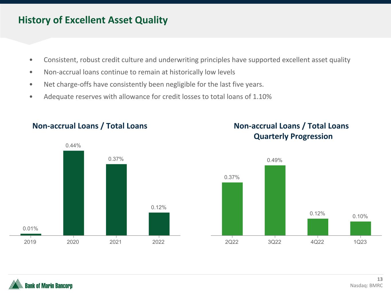 Construction Portfolio Concentrated in Lower-Risk Property Segments 12 Nasdaq: BMRC Marin, 7% Sonoma, 9% San Francisco, 46% Alameda, 23% Other Bay Area, 15% Construction by Type as of 1Q23 Construction Portfolio by County as of 1Q23 Multi-family, 60% Self Storage, 18% 1-4 Residential, 21% Land & Ag, 1% Total Balance: $110MM Unfunded Commitments: $32.4MM # of Loans: 20 Avg. Loan Bal: $5.5MM Largest Loan Bal: $16.1MM Avg. LTV*: 55% *Loan-to-value at origination. $110MM $110MM