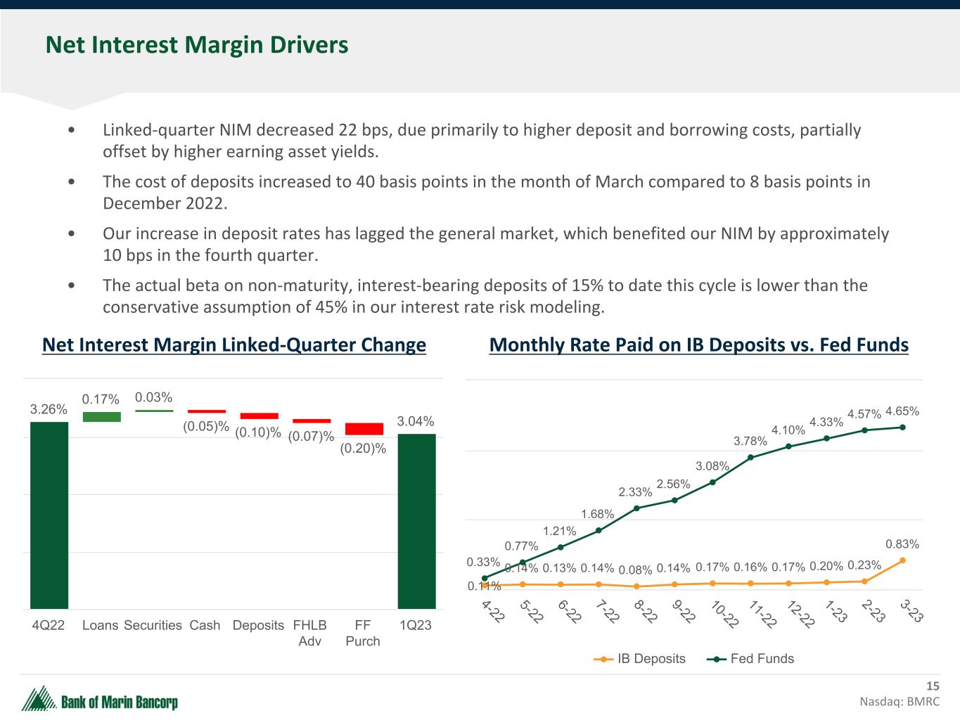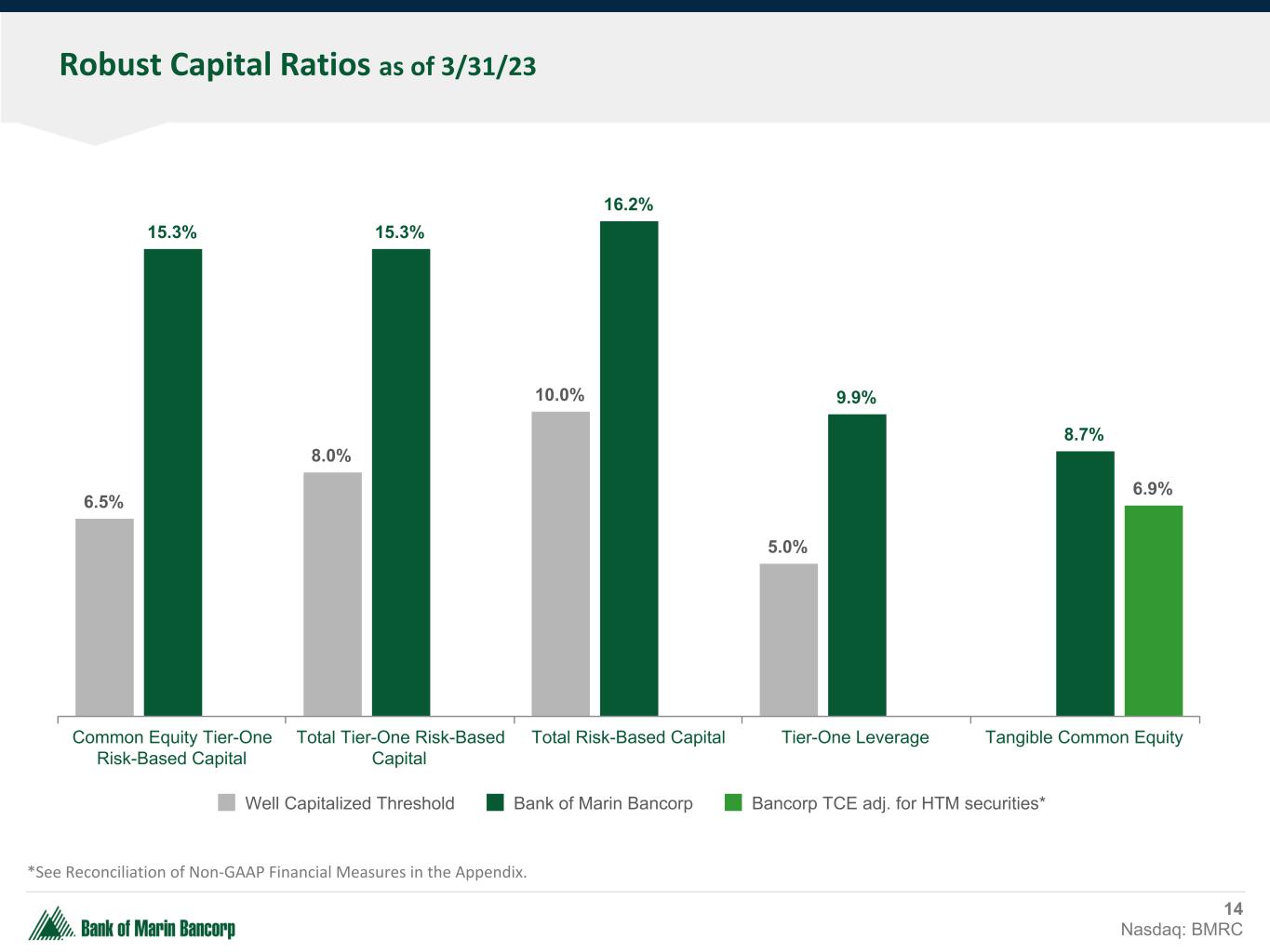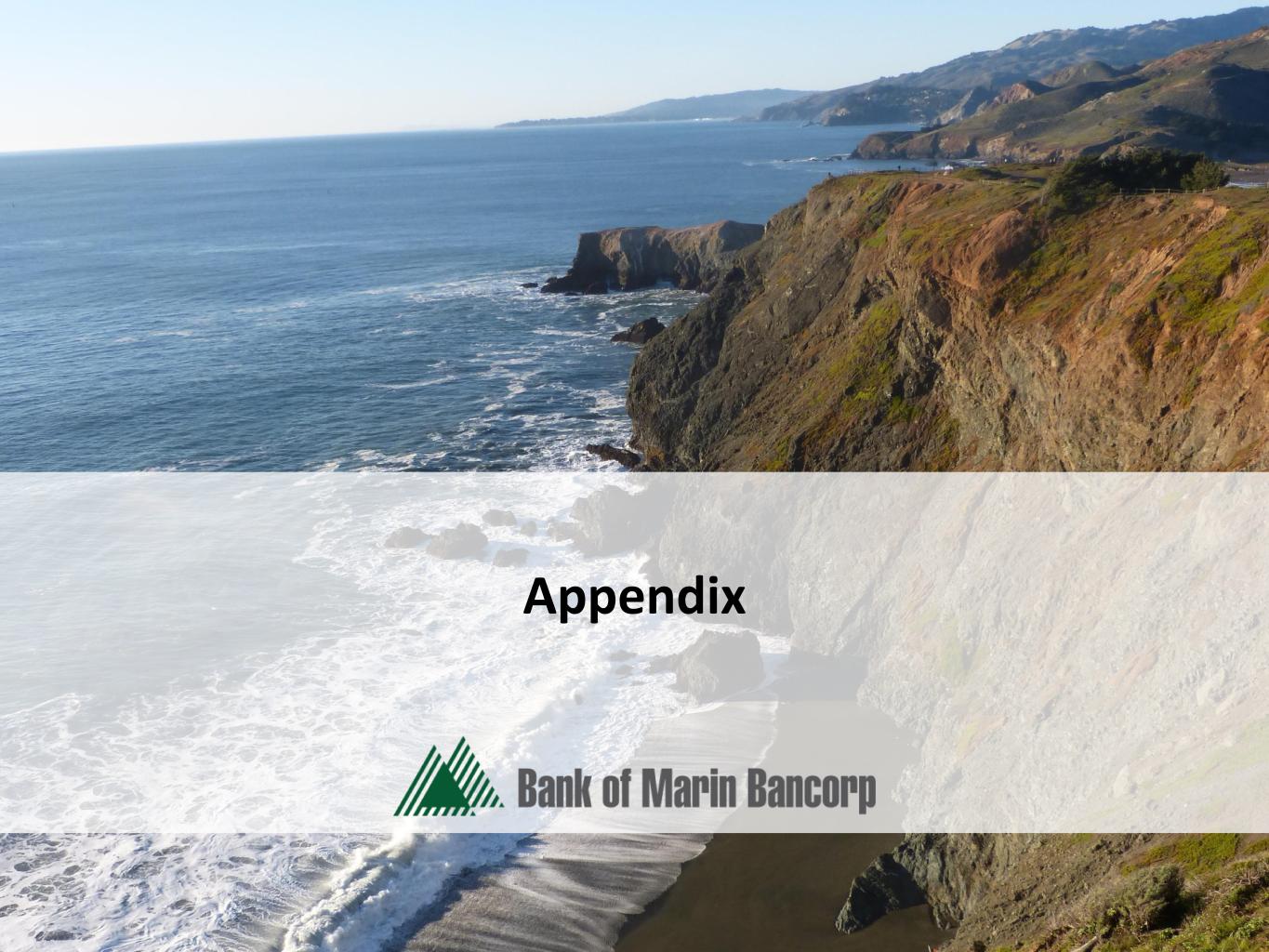 Robust Capital Ratios as of 3/31/23 14 Nasdaq: BMRC 6.5% 8.0% 10.0% 5.0% 15.3% 15.3% 16.2% 9.9% 8.7% 6.9% Well Capitalized Threshold Bank of Marin Bancorp Bancorp TCE adj. for HTM securities* Common Equity Tier-One Risk-Based Capital Total Tier-One Risk-Based Capital Total Risk-Based Capital Tier-One Leverage Tangible Common Equity *See Reconciliation of Non-GAAP Financial Measures in the Appendix.