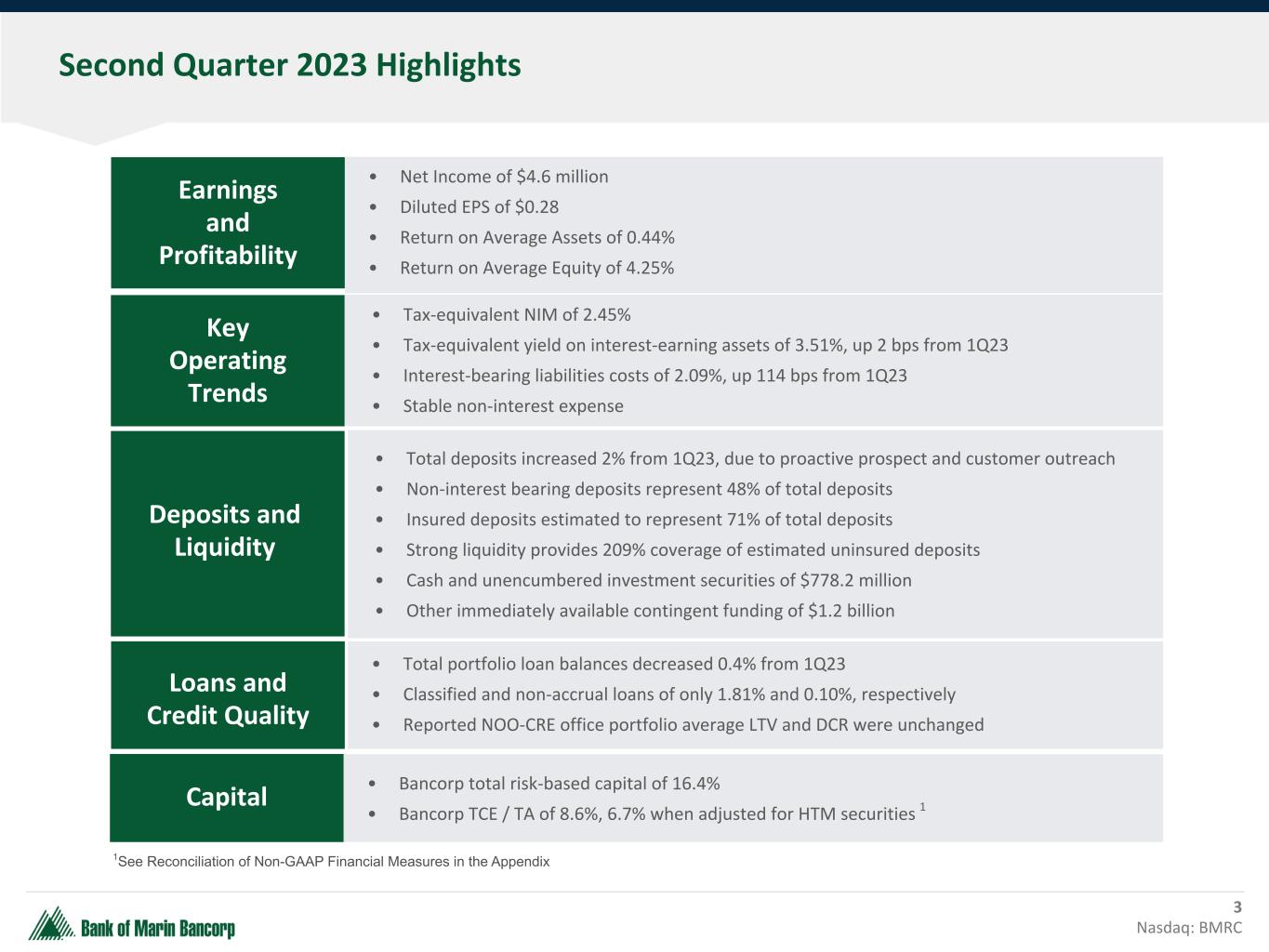 2 Nasdaq: BMRC Forward-Looking Statements This discussion of financial results includes forward-looking statements within the meaning of Section 27A of the Securities Act of 1933, as amended, (the "1933 Act") and Section 21E of the Securities Exchange Act of 1934, as amended, (the "1934 Act"). Those sections of the 1933 Act and 1934 Act provide a "safe harbor" for forward-looking statements to encourage companies to provide prospective information about their financial performance so long as they provide meaningful, cautionary statements identifying important factors that could cause actual results to differ significantly from projected results. Our forward-looking statements include descriptions of plans or objectives of management for future operations, products or services, and forecasts of revenues, earnings or other measures of economic performance. Forward-looking statements can be identified by the fact that they do not relate strictly to historical or current facts. They often include the words "believe," "expect," "intend," "estimate" or words of similar meaning, or future or conditional verbs preceded by "will," "would," "should," "could" or "may." Forward-looking statements are based on management's current expectations regarding economic, legislative, and regulatory issues that may affect our earnings in future periods. Factors that could cause future results to vary materially from current management expectations include, but are not limited to, general economic conditions and the economic uncertainty in the United States and abroad, including economic or other disruptions to financial markets caused by acts of terrorism, war or other conflicts such as Russia's military action in Ukraine, impacts from inflation, supply change disruptions, changes in interest rates (including the actions taken by the Federal Reserve to control inflation), California's unemployment rate, deposit flows, real estate values, and expected future cash flows on loans and securities; costs or effects of acquisitions; competition; changes in accounting principles, policies or guidelines; changes in legislation or regulation; natural disasters (such as wildfires and earthquakes in our area); adverse weather conditions; interruptions of utility service in our markets for sustained periods; and other economic, competitive, governmental, regulatory and technological factors (including external fraud and cybersecurity threats) affecting our operations, pricing, products and services; and successful integration of acquisitions. Important factors that could cause results or performance to materially differ from those expressed in our prior forward-looking statements are detailed in ITEM 1A, Risk Factors section of our December 31, 2022 Form 10-K as filed with the SEC, copies of which are available from us at no charge. Forward-looking statements speak only as of the date they are made. Bancorp undertakes no obligation to release publicly the result of any revisions to these forward-looking statements that may be made to reflect events or circumstances after the date of this press release or to reflect the occurrence of unanticipated events. GAAP to Non-GAAP Financial Measures This presentation includes some non-GAAP financial measures as shown in the Appendix of this presentation. Please refer to the reconciliation of GAAP to Non-GAAP financial measures included on page 5 and 6 of our Form 8-K under Item 9 - Financial Statements and Exhibit 99.1 filed with the SEC on July 24, 2023.