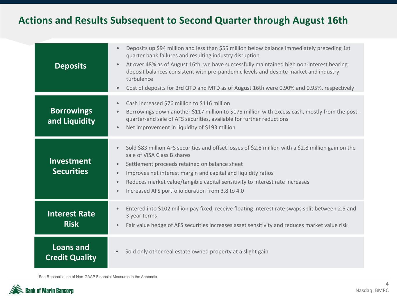 Second Quarter 2023 Highlights 3 Nasdaq: BMRC Earnings and Profitability • Net Income of $4.6 million • Diluted EPS of $0.28 • Return on Average Assets of 0.44% • Return on Average Equity of 4.25% Key Operating Trends Loans and Credit Quality Deposits and Liquidity Capital • Tax-equivalent NIM of 2.45% • Tax-equivalent yield on interest-earning assets of 3.51%, up 2 bps from 1Q23 • Interest-bearing liabilities costs of 2.09%, up 114 bps from 1Q23 • Stable non-interest expense • Total portfolio loan balances decreased 0.4% from 1Q23 • Classified and non-accrual loans of only 1.81% and 0.10%, respectively • Reported NOO-CRE office portfolio average LTV and DCR were unchanged • Total deposits increased 2% from 1Q23, due to proactive prospect and customer outreach • Non-interest bearing deposits represent 48% of total deposits • Insured deposits estimated to represent 71% of total deposits • Strong liquidity provides 209% coverage of estimated uninsured deposits • Cash and unencumbered investment securities of $778.2 million • Other immediately available contingent funding of $1.2 billion • Bancorp total risk-based capital of 16.4% • Bancorp TCE / TA of 8.6%, 6.7% when adjusted for HTM securities 1 1See Reconciliation of Non-GAAP Financial Measures in the Appendix