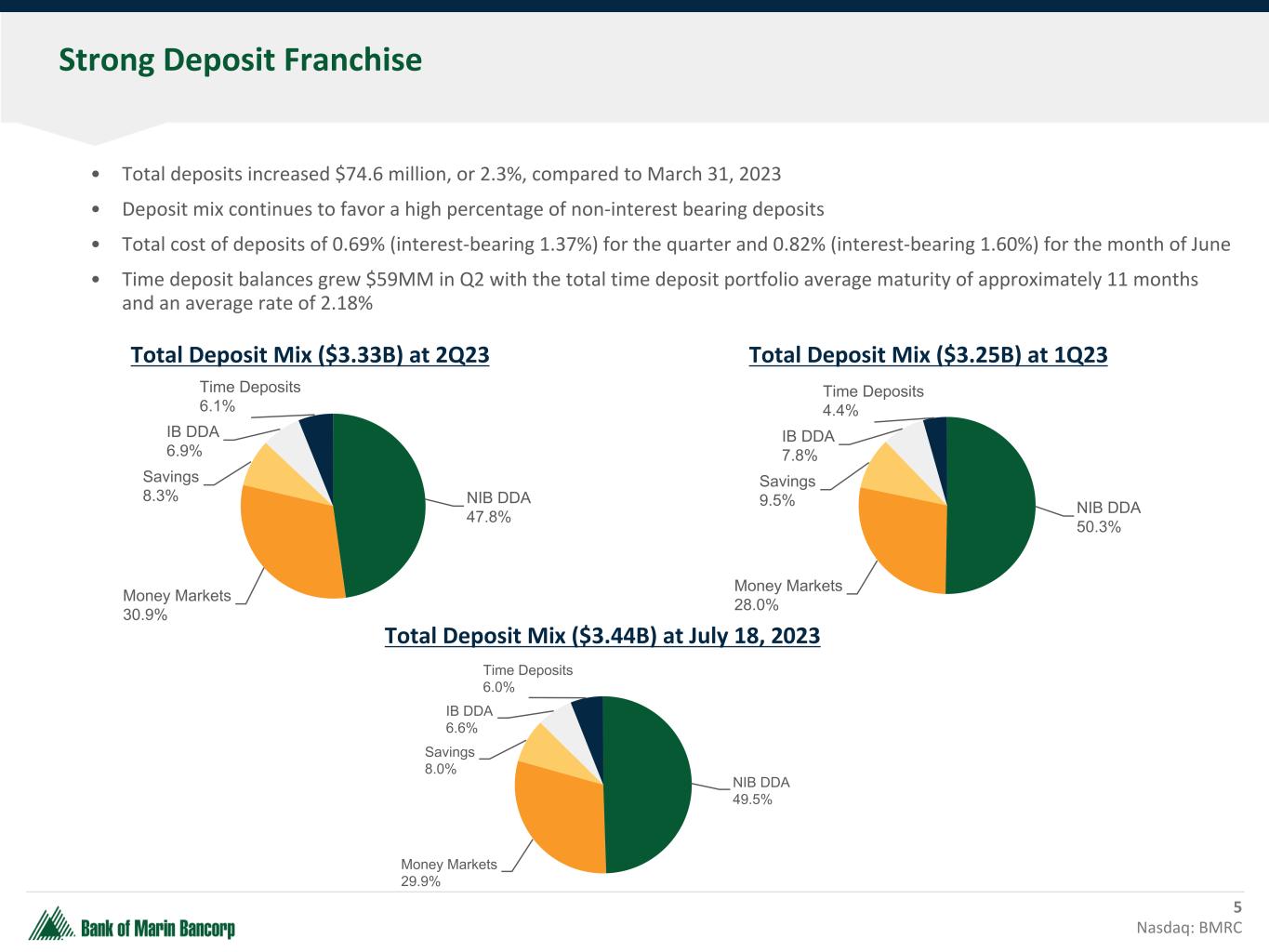 Actions and Results Subsequent to Second Quarter through August 16th 4 Nasdaq: BMRC Deposits Borrowings and Liquidity Interest Rate Risk Investment Securities Loans and Credit Quality • Cash increased $76 million to $116 million • Borrowings down another $117 million to $175 million with excess cash, mostly from the post- quarter-end sale of AFS securities, available for further reductions • Net improvement in liquidity of $193 million • Entered into $102 million pay fixed, receive floating interest rate swaps split between 2.5 and 3 year terms • Fair value hedge of AFS securities increases asset sensitivity and reduces market value risk • Sold $83 million AFS securities and offset losses of $2.8 million with a $2.8 million gain on the sale of VISA Class B shares • Settlement proceeds retained on balance sheet • Improves net interest margin and capital and liquidity ratios • Reduces market value/tangible capital sensitivity to interest rate increases • Increased AFS portfolio duration from 3.8 to 4.0 • Sold only other real estate owned property at a slight gain 1See Reconciliation of Non-GAAP Financial Measures in the Appendix • Deposits up $94 million and less than $55 million below balance immediately preceding 1st quarter bank failures and resulting industry disruption • At over 48% as of August 16th, we have successfully maintained high non-interest bearing deposit balances consistent with pre-pandemic levels and despite market and industry turbulence • Cost of deposits for 3rd QTD and MTD as of August 16th were 0.90% and 0.95%, respectively