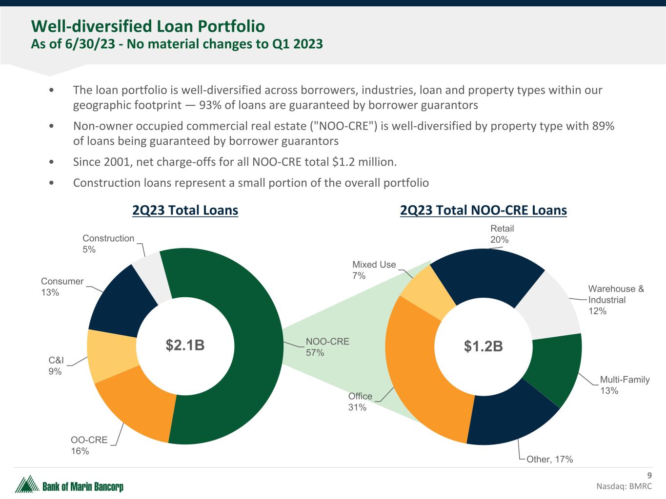 HTM Securities Portfolio Agency MBS/CMO 75% GSEs 15% Municipal Bonds 7% Corporate Bonds 3% AFS Securities Portfolio Agency MBS/CMO 59%GSEs 18% Municipal Bonds 13% SBA 5% Corporate Bonds & Other 4% USTs 1% High-Quality Securities Portfolio Generates Cash Flow Data as of 6/30/23 8 Nasdaq: BMRC $770.9MM $946.8MM Average Yield — 2.14% Approx. Duration — 3.8 Unrealized Losses (after tax) — $60.0 million TCE Bancorp — 8.6% Average Yield — 2.49% Approx. Duration — 5.8 Unrealized Losses (after tax) — $85.0 million TCE Bancorp w/ HTM — 6.7% 1 ($ in millions at Fair Value) ($ in millions at Cost) 1 See Reconciliation of Non-GAAP Financial Measures in the Appendix.