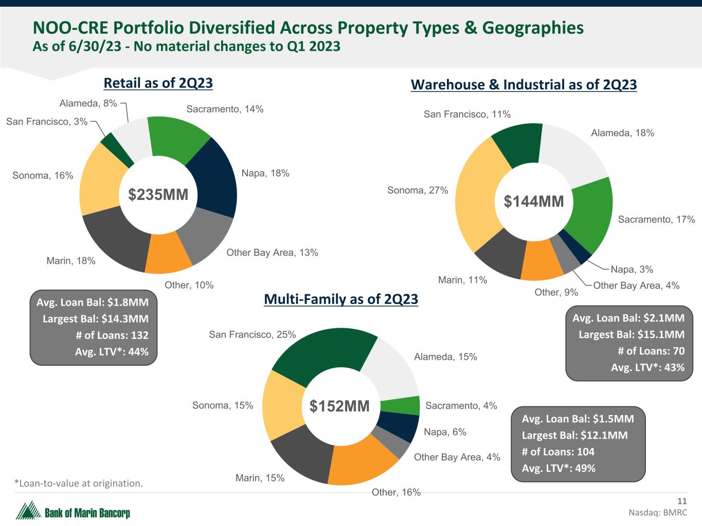 Non-owner Occupied Office Exposure As of 6/30/23 - No material changes to Q1 2023 10 Nasdaq: BMRC • $366 million in exposure spread across our 10-county footprint comprised of 142 loans • $2.6 million average loan balance – largest loan at $17.1 million • 55% average loan-to-value and 1.67x average debt-service coverage ratio* • City of San Francisco NOO-CRE office exposure is 3% of total loan portfolio and 6% of total NOO-CRE loans Marin, 26% Sonoma, 14% San Francisco, 19% Alameda, 7% Sacramento, 6% Napa, 10% Other Bay Area, 14% Other, 4% NOO-CRE Office Portfolio by County City of S.F. NOO-CRE Office Portfolio Total Balance: $71.4 million Average Loan Bal: $6.5 million Number of Loans: 11 loans Average LTV*: 63% Average DCR: 1.20x Average Occupancy: 85% 10 of the 11 properties are low rise buildings, the other is 10 stories. $366MM *Based on the most recent annual review process