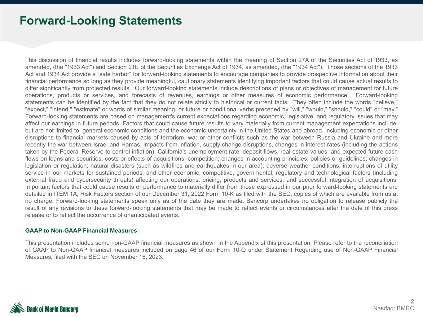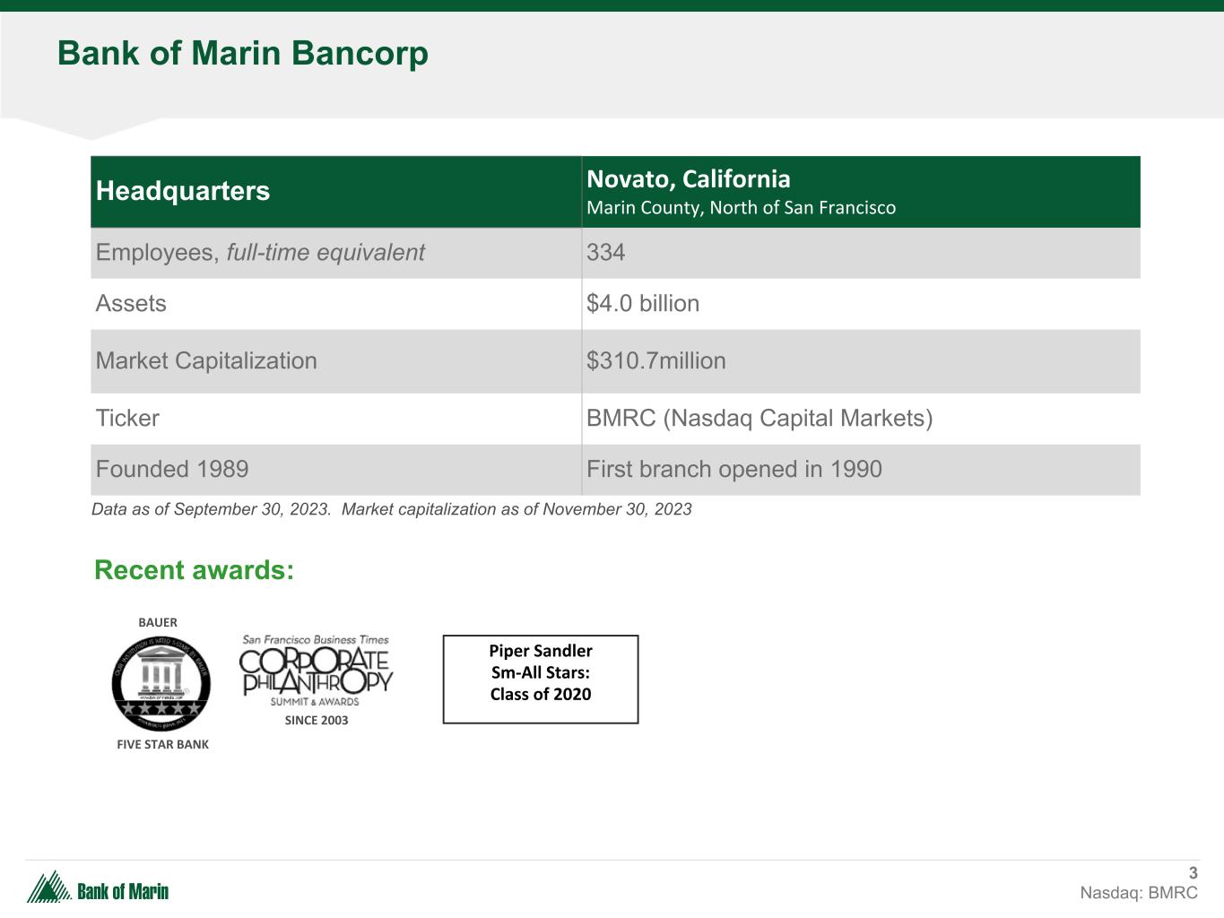 2 Nasdaq: BMRC Forward-Looking Statements This discussion of financial results includes forward-looking statements within the meaning of Section 27A of the Securities Act of 1933, as amended, (the "1933 Act") and Section 21E of the Securities Exchange Act of 1934, as amended, (the "1934 Act"). Those sections of the 1933 Act and 1934 Act provide a "safe harbor" for forward-looking statements to encourage companies to provide prospective information about their financial performance so long as they provide meaningful, cautionary statements identifying important factors that could cause actual results to differ significantly from projected results. Our forward-looking statements include descriptions of plans or objectives of management for future operations, products or services, and forecasts of revenues, earnings or other measures of economic performance. Forward-looking statements can be identified by the fact that they do not relate strictly to historical or current facts. They often include the words "believe," "expect," "intend," "estimate" or words of similar meaning, or future or conditional verbs preceded by "will," "would," "should," "could" or "may." Forward-looking statements are based on management's current expectations regarding economic, legislative, and regulatory issues that may affect our earnings in future periods. Factors that could cause future results to vary materially from current management expectations include, but are not limited to, general economic conditions and the economic uncertainty in the United States and abroad, including economic or other disruptions to financial markets caused by acts of terrorism, war or other conflicts such as the war between Russia and Ukraine and more recently the war between Israel and Hamas, impacts from inflation, supply change disruptions, changes in interest rates (including the actions taken by the Federal Reserve to control inflation), California's unemployment rate, deposit flows, real estate values, and expected future cash flows on loans and securities; costs or effects of acquisitions; competition; changes in accounting principles, policies or guidelines; changes in legislation or regulation; natural disasters (such as wildfires and earthquakes in our area); adverse weather conditions; interruptions of utility service in our markets for sustained periods; and other economic, competitive, governmental, regulatory and technological factors (including external fraud and cybersecurity threats) affecting our operations, pricing, products and services; and successful integration of acquisitions. Important factors that could cause results or performance to materially differ from those expressed in our prior forward-looking statements are detailed in ITEM 1A, Risk Factors section of our December 31, 2022 Form 10-K as filed with the SEC, copies of which are available from us at no charge. Forward-looking statements speak only as of the date they are made. Bancorp undertakes no obligation to release publicly the result of any revisions to these forward-looking statements that may be made to reflect events or circumstances after the date of this press release or to reflect the occurrence of unanticipated events. GAAP to Non-GAAP Financial Measures This presentation includes some non-GAAP financial measures as shown in the Appendix of this presentation. Please refer to the reconciliation of GAAP to Non-GAAP financial measures included on page 46 of our Form 10-Q under Statement Regarding use of Non-GAAP Financial Measures, filed with the SEC on November 16, 2023.