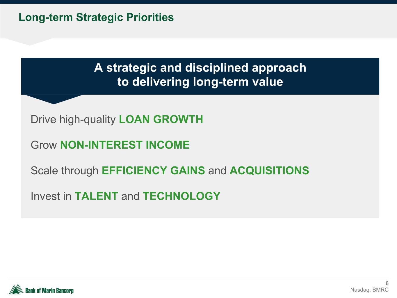 5 • 27 retail branches and 8 commercial banking offices located across 10 Northern California counties. • Sound underwriting produces a high-quality loan portfolio with low credit costs and stable earnings through cycles. • Strong deposit base with competitively priced funding source for lending activity. Delivering a Relationship and Community-focused Banking Model on a Regional Scale (loan production office) (loan production office) AAAAAAA5 Nasdaq: BMRC