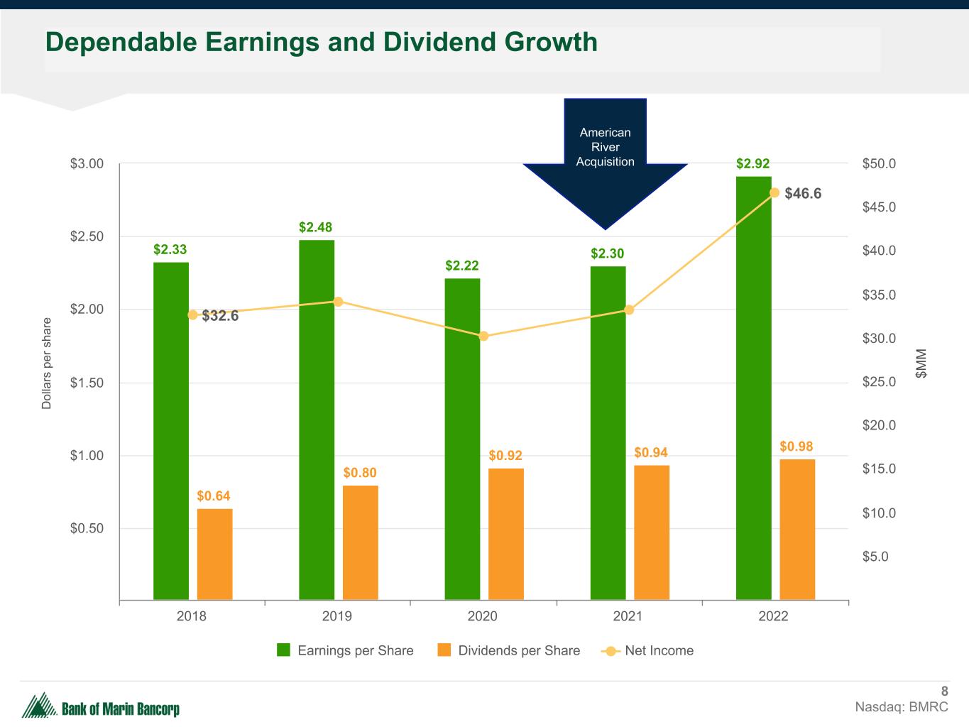 $2.33 $2.48 $2.22 $2.30 $2.92 $0.64 $0.80 $0.92 $0.94 $0.98 $32.6 $46.6 Earnings per Share Dividends per Share Net Income 2018 2019 2020 2021 2022 $0.50 $1.00 $1.50 $2.00 $2.50 $3.00 $5.0 $10.0 $15.0 $20.0 $25.0 $30.0 $35.0 $40.0 $45.0 $50.0 Dependable Earnings and Dividend Growth 8 Nasdaq: BMRC D ol la rs p er s ha re $M M American River Acquisition