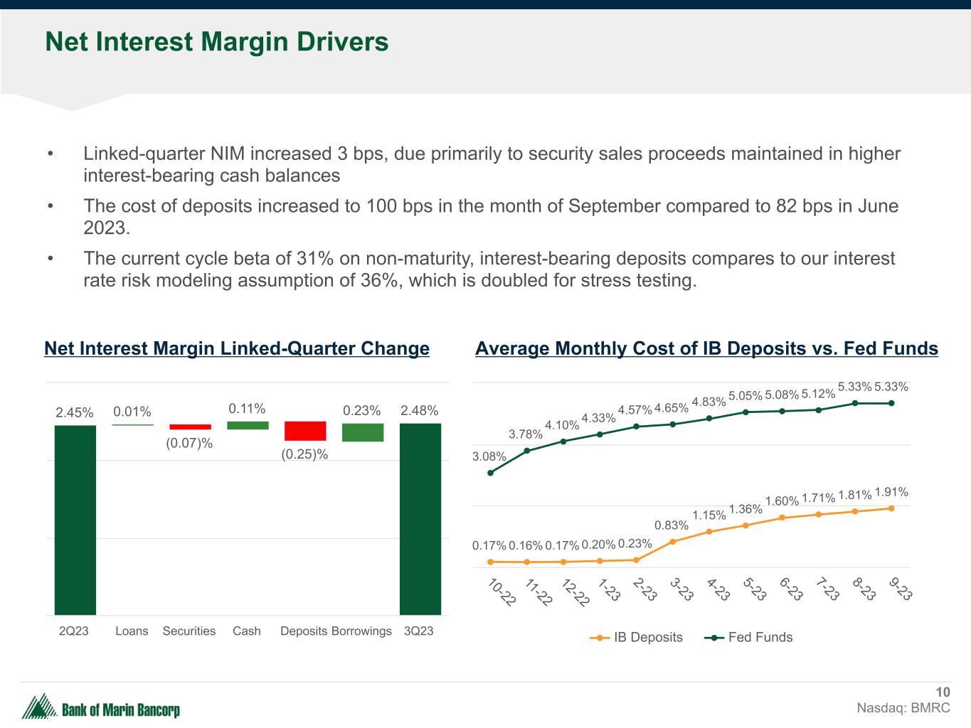 Tax Equivalent Net Interest Margin 9 Nasdaq: BMRC 1 Peer group includes major exchange-traded Western region banks with assets of $2 billion to $10 billion. Peer data as of September 30, 2023. 2 Includes one peer bank with a unique business model and a NIM of 7.1% in Q1, 7.6% in Q2 and in Q3. Excluding this bank, the median NIM would be 3.91% in Q1, 3.56% in Q2 and 3.57% in Q3. 1 3.90% 3.98% 3.55% 3.17% 3.11% 3.04% 2.45% 2.48% 4.19% 4.16% 3.58% 3.36% 3.66% 3.97% 3.66% 3.57% Bank of Marin Bancorp Peer Group Median 2018 2019 2020 2021 2022 Q1'23 Q2'23 Q3'23 2.00% 2.50% 3.00% 3.50% 4.00% 4.50% 2 2 2
