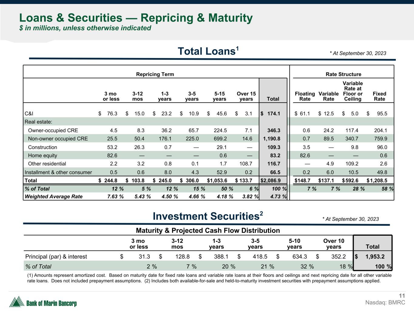 Net Interest Margin Drivers 10 Nasdaq: BMRC • Linked-quarter NIM increased 3 bps, due primarily to security sales proceeds maintained in higher interest-bearing cash balances • The cost of deposits increased to 100 bps in the month of September compared to 82 bps in June 2023. • The current cycle beta of 31% on non-maturity, interest-bearing deposits compares to our interest rate risk modeling assumption of 36%, which is doubled for stress testing. 0.17% 0.16% 0.17% 0.20% 0.23% 0.83% 1.15% 1.36% 1.60% 1.71% 1.81% 1.91% 3.08% 3.78% 4.10% 4.33% 4.57% 4.65% 4.83% 5.05% 5.08% 5.12% 5.33% 5.33% IB Deposits Fed Funds 10-22 11-22 12-22 1-23 2-23 3-23 4-23 5-23 6-23 7-23 8-23 9-23 2.45% 0.01% (0.07)% 0.11% (0.25)% 0.23% 2.48% 2Q23 Loans Securities Cash Deposits Borrowings 3Q23 Net Interest Margin Linked-Quarter Change Average Monthly Cost of IB Deposits vs. Fed Funds