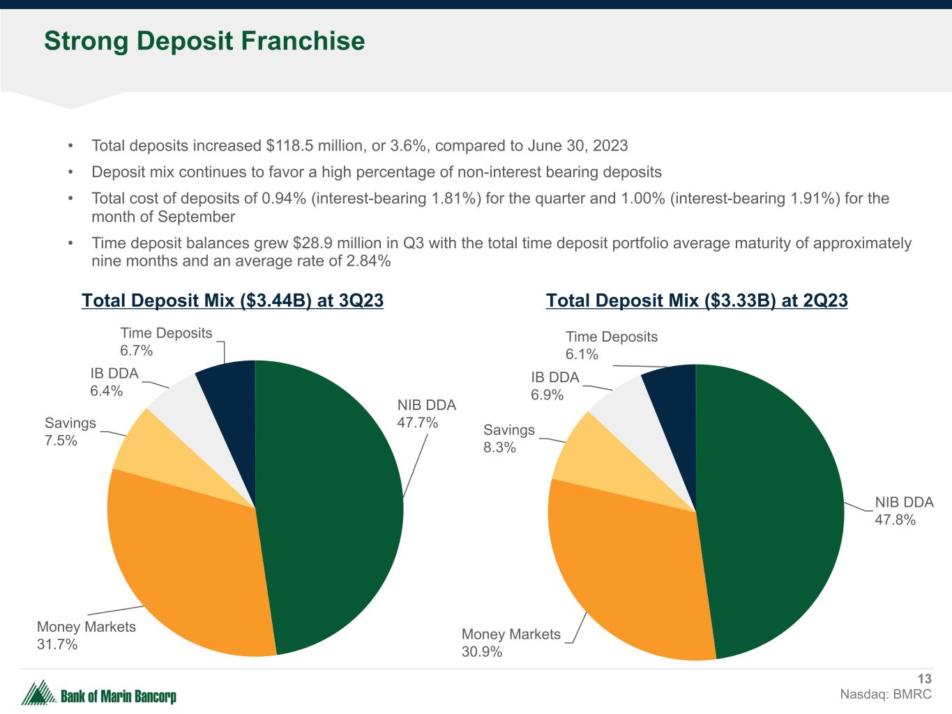 Low Efficiency Ratio Demonstrates Disciplined Expense Control 12 Nasdaq: BMRC 1 Peer group includes major exchange-traded Western region banks with assets of $2 billion to $10 billion. Peer data as of September 30, 2023. 1 57.3% 55.2% 55.6% 63.1% 54.4% 60.2% 76.9% 73.0% 62.0% 62.5% 59.4% 61.7% 57.0% 58.2% 60.9% 61.4% Bank of Marin Bancorp Peer Group Median 2018 2019 2020 2021 2022 Q1'23 Q2'23 Q3'23 50.0% 55.0% 60.0% 65.0% 70.0% 75.0% 80.0% American River acq & early sub debt redemption Cost of deposit market catch up and borrowings increase
