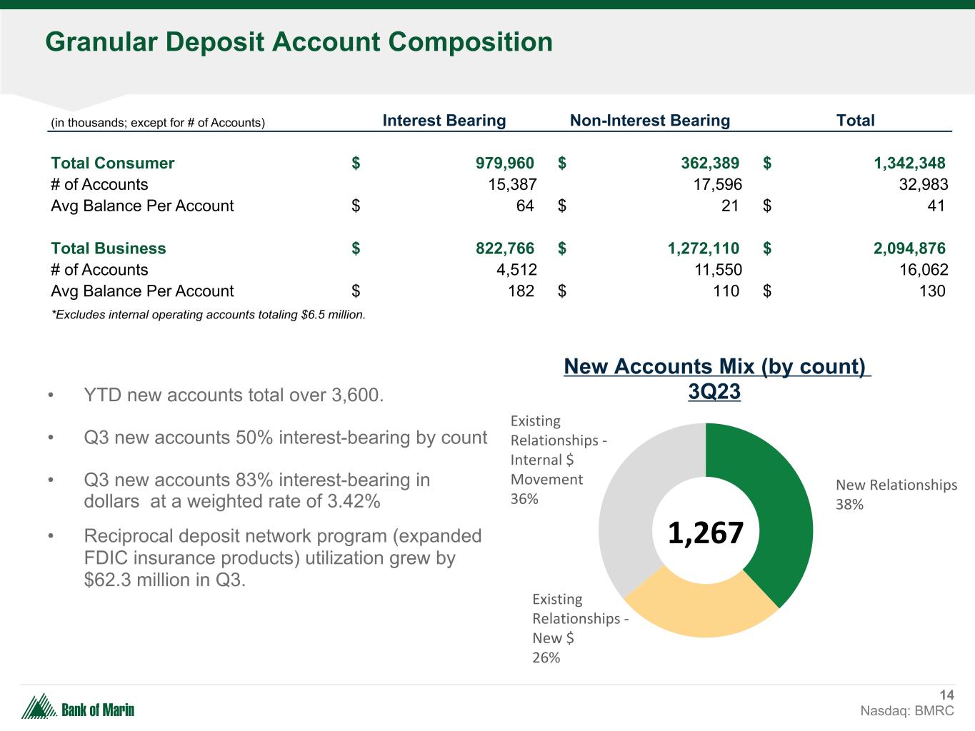 Strong Deposit Franchise 13 Nasdaq: BMRC • Total deposits increased $118.5 million, or 3.6%, compared to June 30, 2023 • Deposit mix continues to favor a high percentage of non-interest bearing deposits • Total cost of deposits of 0.94% (interest-bearing 1.81%) for the quarter and 1.00% (interest-bearing 1.91%) for the month of September • Time deposit balances grew $28.9 million in Q3 with the total time deposit portfolio average maturity of approximately nine months and an average rate of 2.84% NIB DDA 47.7% Money Markets 31.7% Savings 7.5% IB DDA 6.4% Time Deposits 6.7% Total Deposit Mix ($3.44B) at 3Q23 NIB DDA 47.8% Money Markets 30.9% Savings 8.3% IB DDA 6.9% Time Deposits 6.1% Total Deposit Mix ($3.33B) at 2Q23