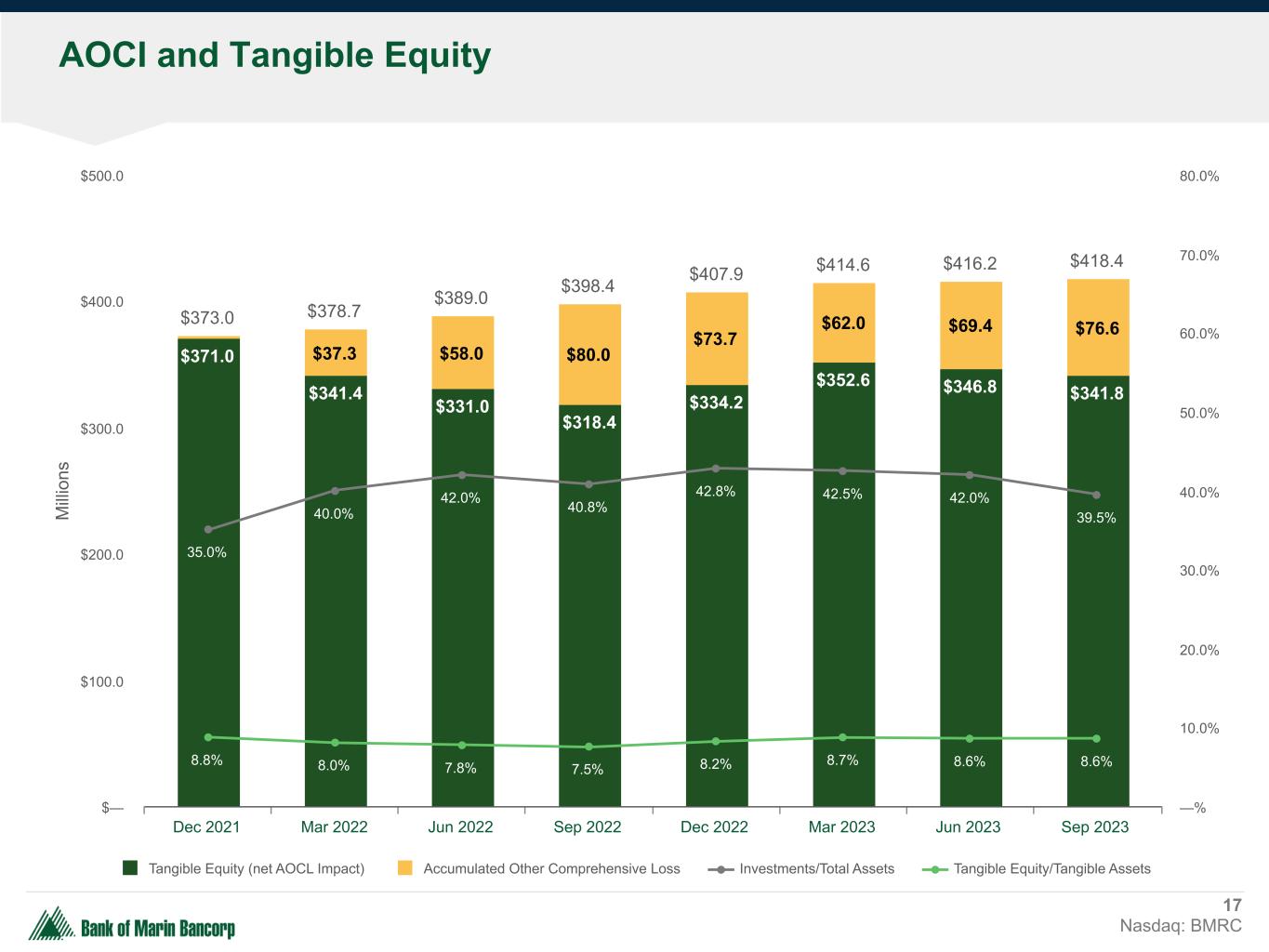HTM Securities Portfolio Agency MBS/CMO 74% GSEs 16% Municipal Bonds 7% Corporate Bonds 3% AFS Securities Portfolio Agency MBS/CMO 59%GSEs 18% Municipal Bonds 13% SBA 4% Corporate Bonds & Other 5% USTs 1% High-Quality Securities Portfolio Generates Cash Flow Data as of 9/30/23 16 Nasdaq: BMRC $658.8MM $935.1MM Average Yield — 1.94% Approx. Duration — 4.07 Unrealized Losses (after tax) — $67.8 million TCE Bancorp — 8.6% Average Yield — 2.47% Approx. Duration — 5.95 Unrealized Losses (after tax) — $107.0 million TCE Bancorp w/ HTM — 6.1% 1 ($ in millions at Fair Value) ($ in millions at Cost) 1 See Reconciliation of Non-GAAP Financial Measures in the Appendix. ($ in millions at Fair Value)