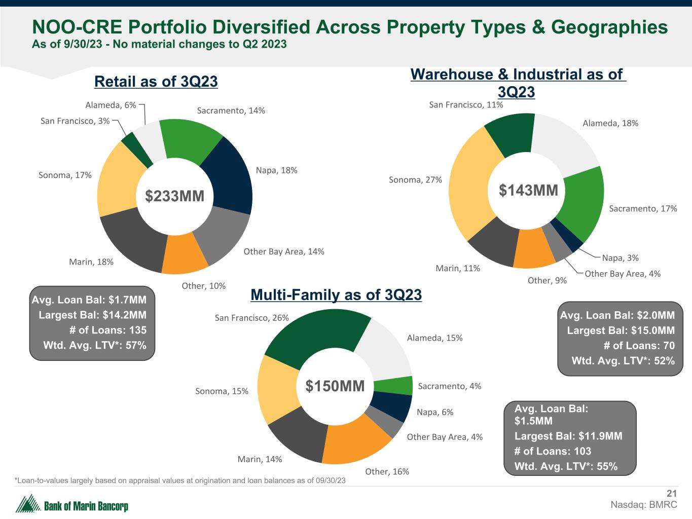 Non-owner Occupied Office Exposure As of 9/30/23 - No material changes to Q2 2023 20 Nasdaq: BMRC • $364 million in exposure spread across our lending footprint comprised of 142 loans • $2.6 million average loan balance – largest loan at $17.0 million • 56% weighted average loan-to-value and 1.68x weighted average debt-service coverage ratio* • City of San Francisco NOO-CRE office exposure is 3% of total loan portfolio and 6% of total NOO- CRE loans Marin, 26% Sonoma, 14% San Francisco, 19% Alameda, 7% Sacramento, 6% Napa, 10% Other Bay Area, 14% Other, 4% NOO-CRE Office Portfolio by County City of S.F. NOO-CRE Office Portfolio Total Balance: $71.1 million Average Loan Bal: $6.5 million Number of Loans: 11 loans Wtd. Average LTV*: 66% Wtd. Average DCR: 1.07x Average Occupancy: 88% 10 of the 11 properties are low rise buildings, the other is 10 stories. $364MM *Based on the most recent annual review process