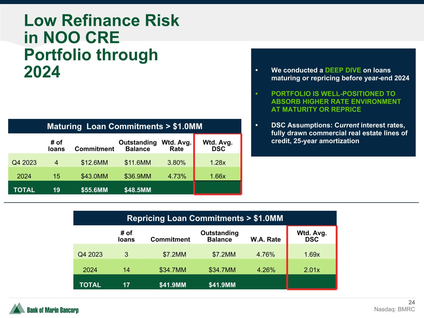 Construction Portfolio Concentrated in Lower-Risk Property Segments As of 9/30/23 - No material changes to Q2 2023 23 Nasdaq: BMRC Marin, 8% Sonoma, 1% San Francisco, 47% Alameda, 29% Other Bay Area, 15% Construction by Type as of 3Q23 Construction Portfolio by County as of 3Q23 Multi-family, 65% Self Storage, 10% 1-4 Residential, 24% Land & Ag, 1% Total Balance: $109.3MM Unfunded Commitments: $17.9MM # of Loans: 18 Avg. Loan Bal: $6.1MM Largest Loan Bal: $17.8MM Wtd. Avg. LTV*: 61% $109MM $109MM *Loan-to-value largely based on appraisal values at origination and loan balances as of 09/30/23