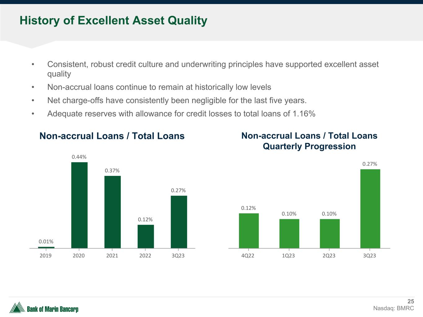 Low Refinance Risk in NOO CRE Portfolio through 2024 24 Nasdaq: BMRC # of loans Commitment Outstanding Balance Wtd. Avg. Rate Wtd. Avg. DSC Q4 2023 4 $12.6MM $11.6MM 3.80% 1.28x 2024 15 $43.0MM $36.9MM 4.73% 1.66x TOTAL 19 $55.6MM $48.5MM # of loans Commitment Outstanding Balance W.A. Rate Wtd. Avg. DSC Q4 2023 3 $7.2MM $7.2MM 4.76% 1.69x 2024 14 $34.7MM $34.7MM 4.26% 2.01x TOTAL 17 $41.9MM $41.9MM Maturing Loan Commitments > $1.0MM Repricing Loan Commitments > $1.0MM • We conducted a DEEP DIVE on loans maturing or repricing before year-end 2024 • PORTFOLIO IS WELL-POSITIONED TO ABSORB HIGHER RATE ENVIRONMENT AT MATURITY OR REPRICE • DSC Assumptions: Current interest rates, fully drawn commercial real estate lines of credit, 25-year amortization
