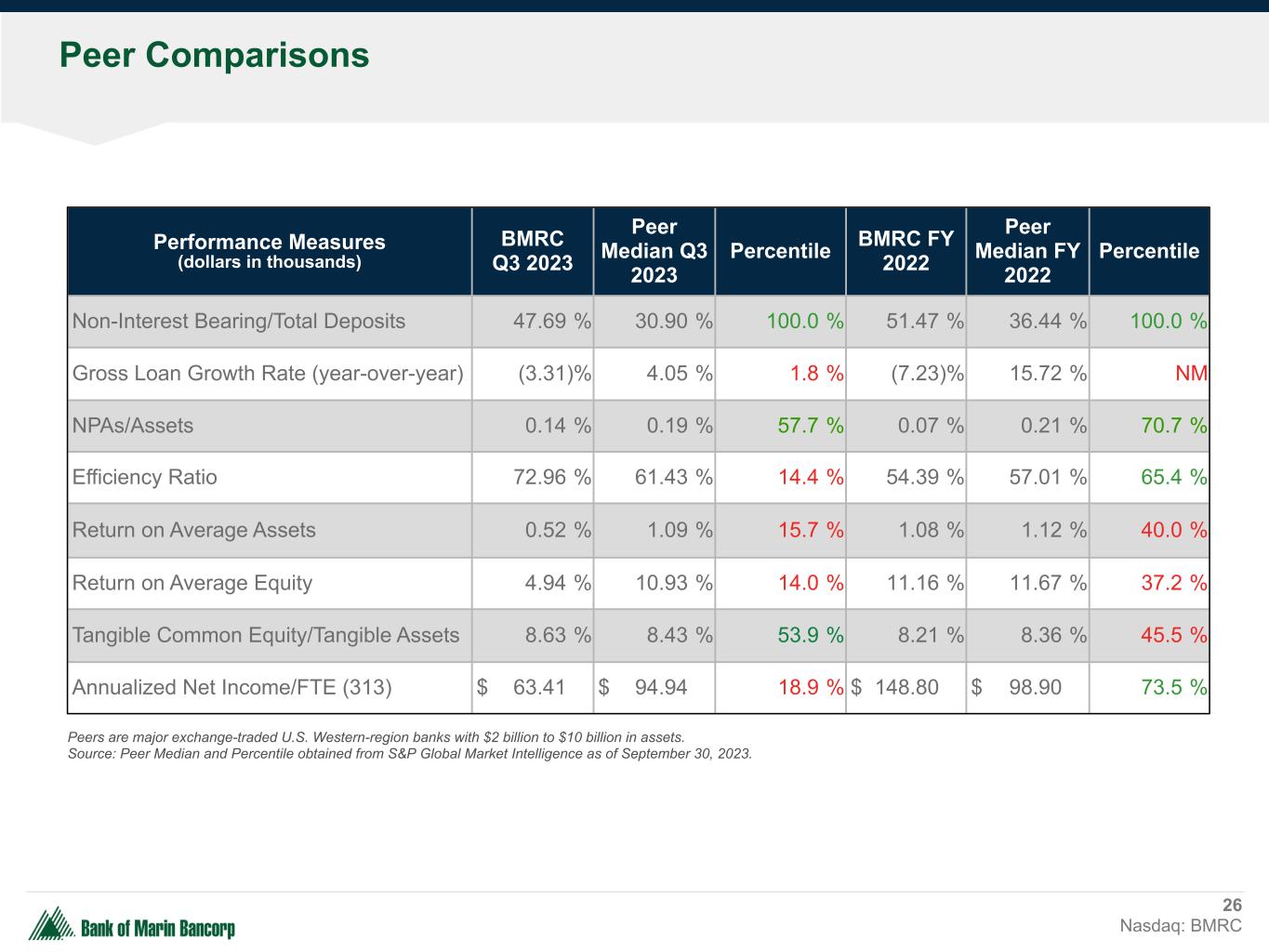 Peer Comparisons Performance Measures (dollars in thousands) BMRC Q3 2023 Peer Median Q3 2023 Percentile BMRC FY 2022 Peer Median FY 2022 Percentile Non-Interest Bearing/Total Deposits 47.69 % 30.90 % 100.0 % 51.47 % 36.44 % 100.0 % Gross Loan Growth Rate (year-over-year) (3.31) % 4.05 % 1.8 % (7.23) % 15.72 % NM NPAs/Assets 0.14 % 0.19 % 57.7 % 0.07 % 0.21 % 70.7 % Efficiency Ratio 72.96 % 61.43 % 14.4 % 54.39 % 57.01 % 65.4 % Return on Average Assets 0.52 % 1.09 % 15.7 % 1.08 % 1.12 % 40.0 % Return on Average Equity 4.94 % 10.93 % 14.0 % 11.16 % 11.67 % 37.2 % Tangible Common Equity/Tangible Assets 8.63 % 8.43 % 53.9 % 8.21 % 8.36 % 45.5 % Annualized Net Income/FTE (313) $ 63.41 $ 94.94 18.9 % $ 148.80 $ 98.90 73.5 % Peers are major exchange-traded U.S. Western-region banks with $2 billion to $10 billion in assets. Source: Peer Median and Percentile obtained from S&P Global Market Intelligence as of September 30, 2023. 26 Nasdaq: BMRC