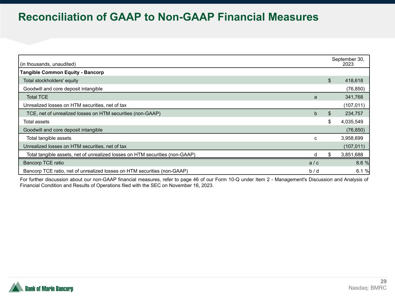Reconciliation of GAAP to Non-GAAP Financial Measures 29 Nasdaq: BMRC (in thousands, unaudited) September 30, 2023 Tangible Common Equity - Bancorp Total stockholders' equity $ 418,618 Goodwill and core deposit intangible (76,850) Total TCE a 341,768 Unrealized losses on HTM securities, net of tax (107,011) TCE, net of unrealized losses on HTM securities (non-GAAP) b $ 234,757 Total assets $ 4,035,549 Goodwill and core deposit intangible (76,850) Total tangible assets c 3,958,699 Unrealized losses on HTM securities, net of tax (107,011) Total tangible assets, net of unrealized losses on HTM securities (non-GAAP) d $ 3,851,688 Bancorp TCE ratio a / c 8.6 % Bancorp TCE ratio, net of unrealized losses on HTM securities (non-GAAP) b / d 6.1 % For further discussion about our non-GAAP financial measures, refer to page 46 of our Form 10-Q under Item 2 - Management's Discussion and Analysis of Financial Condition and Results of Operations filed with the SEC on November 16, 2023.