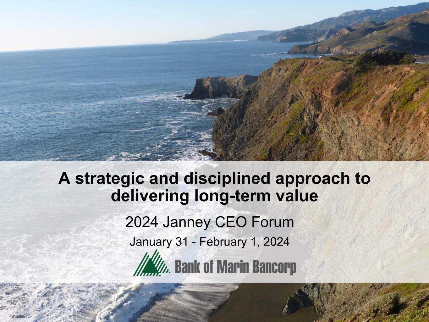 3 Bank of Marin Bancorp Recent awards: FIVE STAR BANK BAUER Headquarters Novato, California Marin County, North of San Francisco Employees, full-time equivalent 329 Assets $3.8 billion Market Capitalization $355.8 million Ticker BMRC (Nasdaq Capital Markets) Founded 1989 First branch opened in 1990 Piper Sandler Sm-All Stars: Class of 2020 SINCE 2003 Data as of December 31, 2023 AAAAAAAAAA AAA 3 Nasdaq: BMRC