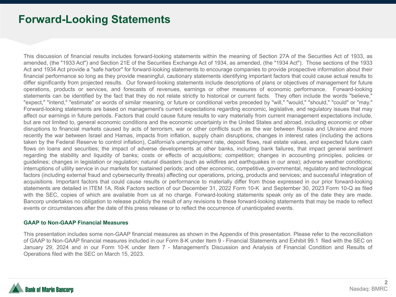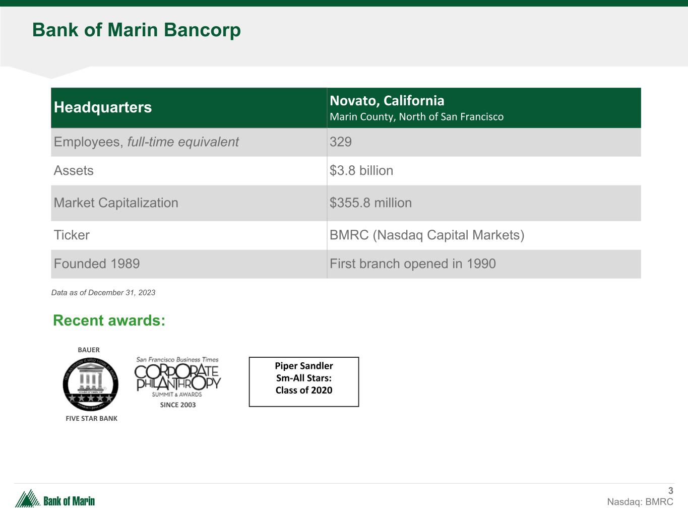 2 Nasdaq: BMRC Forward-Looking Statements This discussion of financial results includes forward-looking statements within the meaning of Section 27A of the Securities Act of 1933, as amended, (the "1933 Act") and Section 21E of the Securities Exchange Act of 1934, as amended, (the "1934 Act"). Those sections of the 1933 Act and 1934 Act provide a "safe harbor" for forward-looking statements to encourage companies to provide prospective information about their financial performance so long as they provide meaningful, cautionary statements identifying important factors that could cause actual results to differ significantly from projected results. Our forward-looking statements include descriptions of plans or objectives of management for future operations, products or services, and forecasts of revenues, earnings or other measures of economic performance. Forward-looking statements can be identified by the fact that they do not relate strictly to historical or current facts. They often include the words "believe," "expect," "intend," "estimate" or words of similar meaning, or future or conditional verbs preceded by "will," "would," "should," "could" or "may." Forward-looking statements are based on management's current expectations regarding economic, legislative, and regulatory issues that may affect our earnings in future periods. Factors that could cause future results to vary materially from current management expectations include, but are not limited to, general economic conditions and the economic uncertainty in the United States and abroad, including economic or other disruptions to financial markets caused by acts of terrorism, war or other conflicts such as the war between Russia and Ukraine and more recently the war between Israel and Hamas, impacts from inflation, supply chain disruptions, changes in interest rates (including the actions taken by the Federal Reserve to control inflation), California's unemployment rate, deposit flows, real estate values, and expected future cash flows on loans and securities; the impact of adverse developments at other banks, including bank failures, that impact general sentiment regarding the stability and liquidity of banks; costs or effects of acquisitions; competition; changes in accounting principles, policies or guidelines; changes in legislation or regulation; natural disasters (such as wildfires and earthquakes in our area); adverse weather conditions; interruptions of utility service in our markets for sustained periods; and other economic, competitive, governmental, regulatory and technological factors (including external fraud and cybersecurity threats) affecting our operations, pricing, products and services; and successful integration of acquisitions. Important factors that could cause results or performance to materially differ from those expressed in our prior forward-looking statements are detailed in ITEM 1A, Risk Factors section of our December 31, 2022 Form 10-K and September 30, 2023 Form 10-Q as filed with the SEC, copies of which are available from us at no charge. Forward-looking statements speak only as of the date they are made. Bancorp undertakes no obligation to release publicly the result of any revisions to these forward-looking statements that may be made to reflect events or circumstances after the date of this press release or to reflect the occurrence of unanticipated events. GAAP to Non-GAAP Financial Measures This presentation includes some non-GAAP financial measures as shown in the Appendix of this presentation. Please refer to the reconciliation of GAAP to Non-GAAP financial measures included in our Form 8-K under Item 9 - Financial Statements and Exhibit 99.1 filed with the SEC on January 29, 2024 and in our Form 10-K under Item 7 - Management's Discussion and Analysis of Financial Condition and Results of Operations filed with the SEC on March 15, 2023.