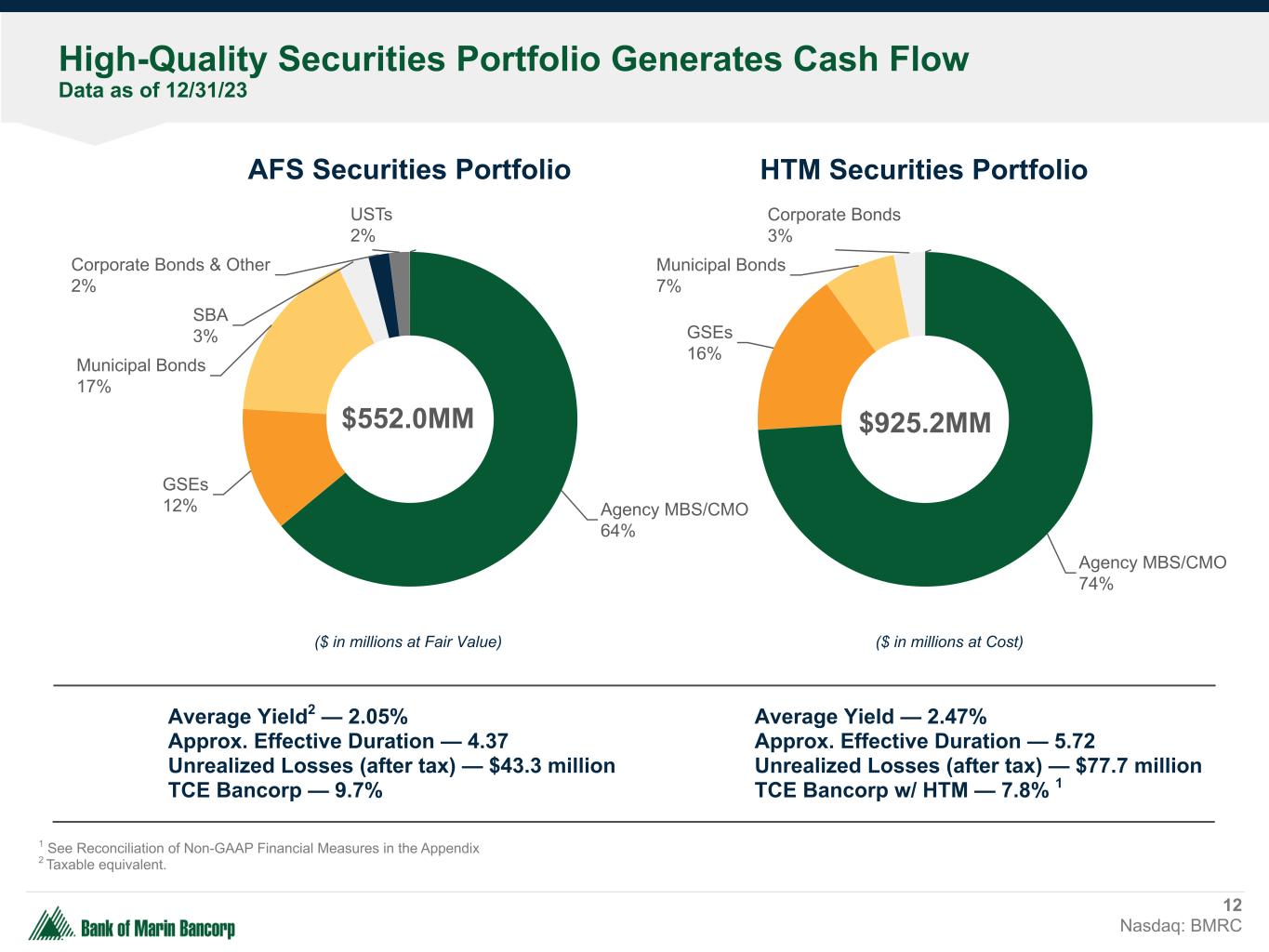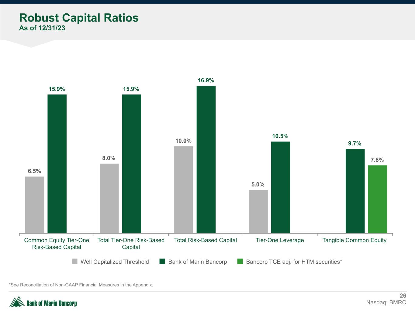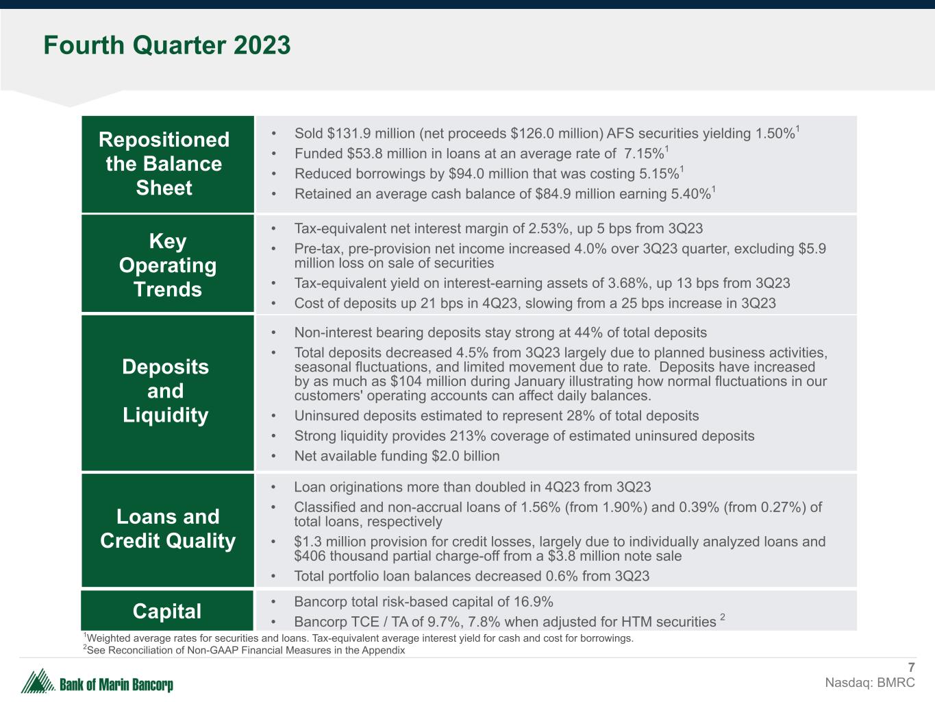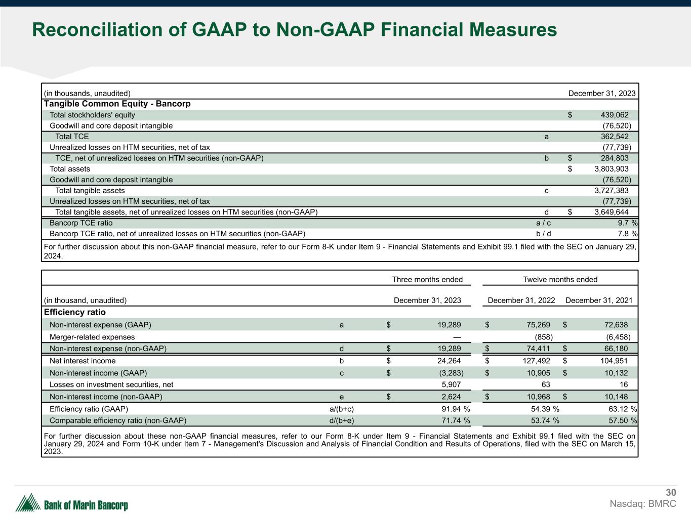 Reconciliation of GAAP to Non-GAAP Financial Measures 30 Nasdaq: BMRC (in thousands, unaudited) December 31, 2023 Tangible Common Equity - Bancorp Total stockholders' equity $ 439,062 Goodwill and core deposit intangible (76,520) Total TCE a 362,542 Unrealized losses on HTM securities, net of tax (77,739) TCE, net of unrealized losses on HTM securities (non-GAAP) b $ 284,803 Total assets $ 3,803,903 Goodwill and core deposit intangible (76,520) Total tangible assets c 3,727,383 Unrealized losses on HTM securities, net of tax (77,739) Total tangible assets, net of unrealized losses on HTM securities (non-GAAP) d $ 3,649,644 Bancorp TCE ratio a / c 9.7 % Bancorp TCE ratio, net of unrealized losses on HTM securities (non-GAAP) b / d 7.8 % For further discussion about this non-GAAP financial measure, refer to our Form 8-K under Item 9 - Financial Statements and Exhibit 99.1 filed with the SEC on January 29, 2024. Three months ended Twelve months ended (in thousand, unaudited) December 31, 2023 December 31, 2022 December 31, 2021 Efficiency ratio Non-interest expense (GAAP) a $ 19,289 $ 75,269 $ 72,638 Merger-related expenses — (858) (6,458) Non-interest expense (non-GAAP) d $ 19,289 $ 74,411 $ 66,180 Net interest income b $ 24,264 $ 127,492 $ 104,951 Non-interest income (GAAP) c $ (3,283) $ 10,905 $ 10,132 Losses on investment securities, net 5,907 63 16 Non-interest income (non-GAAP) e $ 2,624 $ 10,968 $ 10,148 Efficiency ratio (GAAP) a/(b+c) 91.94 % 54.39 % 63.12 % Comparable efficiency ratio (non-GAAP) d/(b+e) 71.74 % 53.74 % 57.50 % For further discussion about these non-GAAP financial measures, refer to our Form 8-K under Item 9 - Financial Statements and Exhibit 99.1 filed with the SEC on January 29, 2024 and Form 10-K under Item 7 - Management's Discussion and Analysis of Financial Condition and Results of Operations, filed with the SEC on March 15, 2023.
