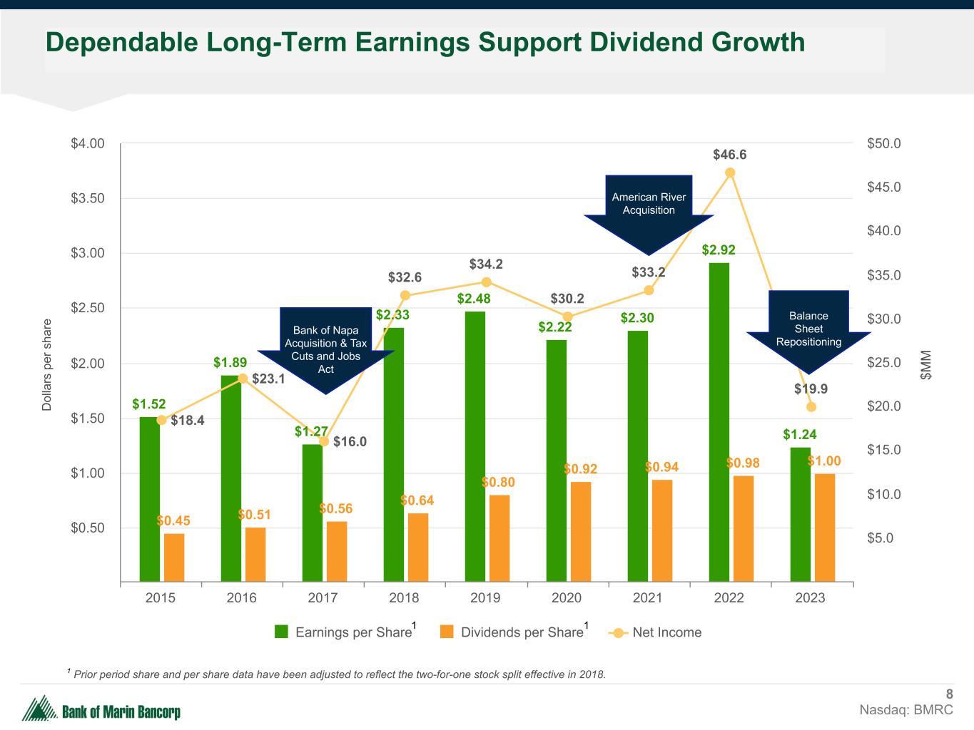 Fourth Quarter 2023 7 Nasdaq: BMRC Repositioned the Balance Sheet • Sold $131.9 million (net proceeds $126.0 million) AFS securities yielding 1.50%1 • Funded $53.8 million in loans at an average rate of 7.15%1 • Reduced borrowings by $94.0 million that was costing 5.15%1 • Retained an average cash balance of $84.9 million earning 5.40%1 Key Operating Trends Loans and Credit Quality Deposits and Liquidity Capital • Tax-equivalent net interest margin of 2.53%, up 5 bps from 3Q23 • Pre-tax, pre-provision net income increased 4.0% over 3Q23 quarter, excluding $5.9 million loss on sale of securities • Tax-equivalent yield on interest-earning assets of 3.68%, up 13 bps from 3Q23 • Cost of deposits up 21 bps in 4Q23, slowing from a 25 bps increase in 3Q23 • Non-interest bearing deposits stay strong at 44% of total deposits • Total deposits decreased 4.5% from 3Q23 largely due to planned business activities, seasonal fluctuations, and limited movement due to rate. Deposits have increased by as much as $104 million during January illustrating how normal fluctuations in our customers' operating accounts can affect daily balances. • Uninsured deposits estimated to represent 28% of total deposits • Strong liquidity provides 213% coverage of estimated uninsured deposits • Net available funding $2.0 billion • Bancorp total risk-based capital of 16.9% • Bancorp TCE / TA of 9.7%, 7.8% when adjusted for HTM securities 2 1Weighted average rates for securities and loans. Tax-equivalent average interest yield for cash and cost for borrowings. 2See Reconciliation of Non-GAAP Financial Measures in the Appendix • Loan originations more than doubled in 4Q23 from 3Q23 • Classified and non-accrual loans of 1.56% (from 1.90%) and 0.39% (from 0.27%) of total loans, respectively • $1.3 million provision for credit losses, largely due to individually analyzed loans and $406 thousand partial charge-off from a $3.8 million note sale • Total portfolio loan balances decreased 0.6% from 3Q23