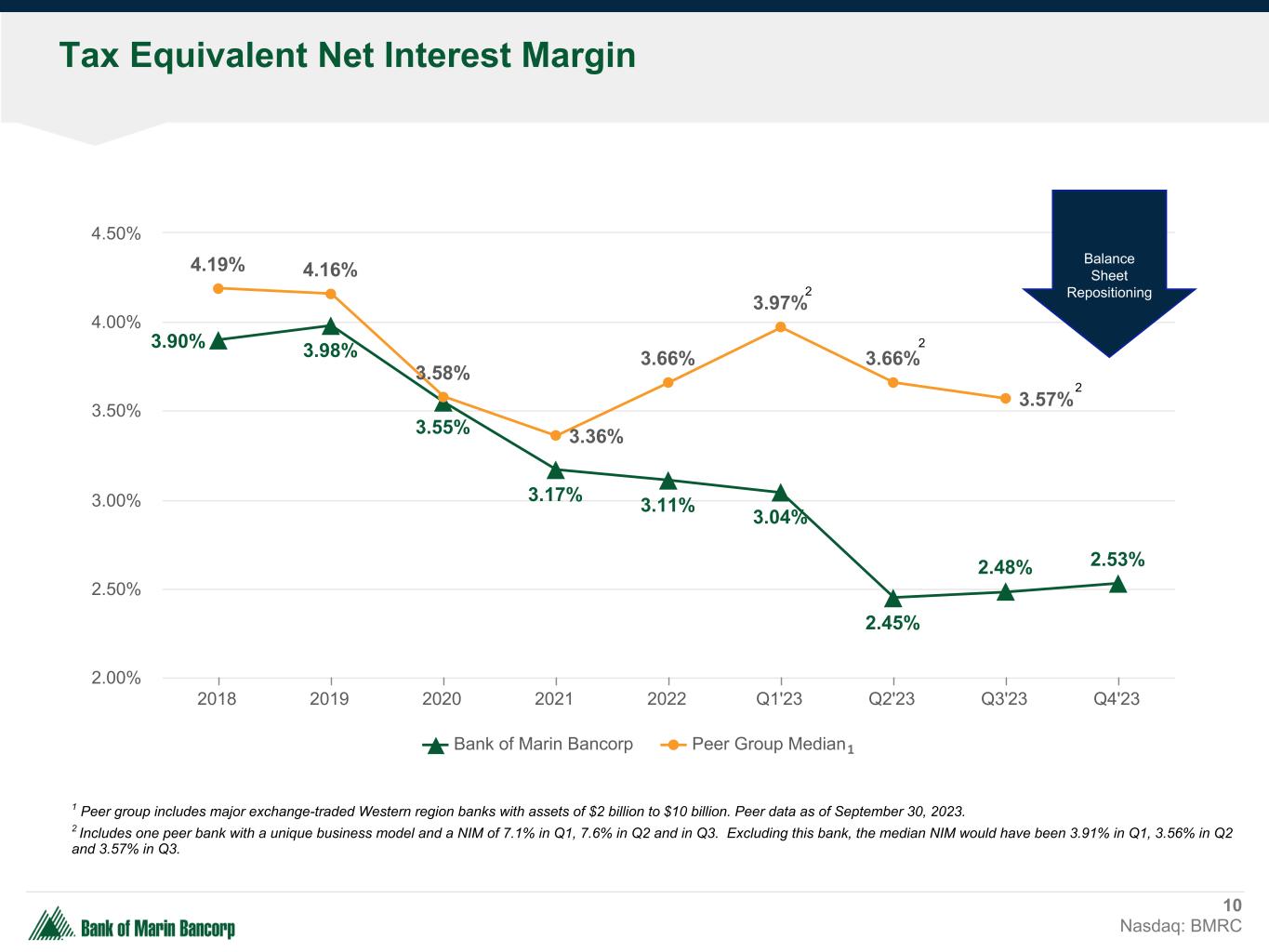 (in thousands) Market Value AFS & HTM Securities T/E Book Yield Effective Duration Pre-Tax Unrealized Gains (Losses) Pre-Tax Realized Losses After-Tax Realized Losses1 AFS % of Total Investments Securities Portfolio as of 9/30/2023 $1,442,031 2.24% 4.9 $(248,149) N/A N/A 45% Q4 Securities Sales $125,955 1.50% 1.5 $5,907 $(5,907) $(4,160) Q4 Change in Pre- Tax Unrealized Losses N/A N/A N/A $70,423 N/A N/A Securities Portfolio as of 12/31/2023 $1,366,858 2.31% 5.1 $(171,819) N/A N/A 36% Strategic Balance Sheet Repositioning During the Quarter • Bank generated $126 million in proceeds from AFS security sales with an average yield of 1.50%. • Proceeds paid down borrowings and were reinvested into higher yielding assets ◦ Anticipated benefits to: earnings per share, net interest margin, return on assets, and other metrics • POST REPOSITIONING, AVERAGE BOOK YIELD OF SECURITIES PORTFOLIO INCREASED 7 BPS AND EFFECTIVE DURATION INCREASED 0.2 9 Nasdaq: BMRC 1Applied a blended state and federal statutory rate of 29.56%,