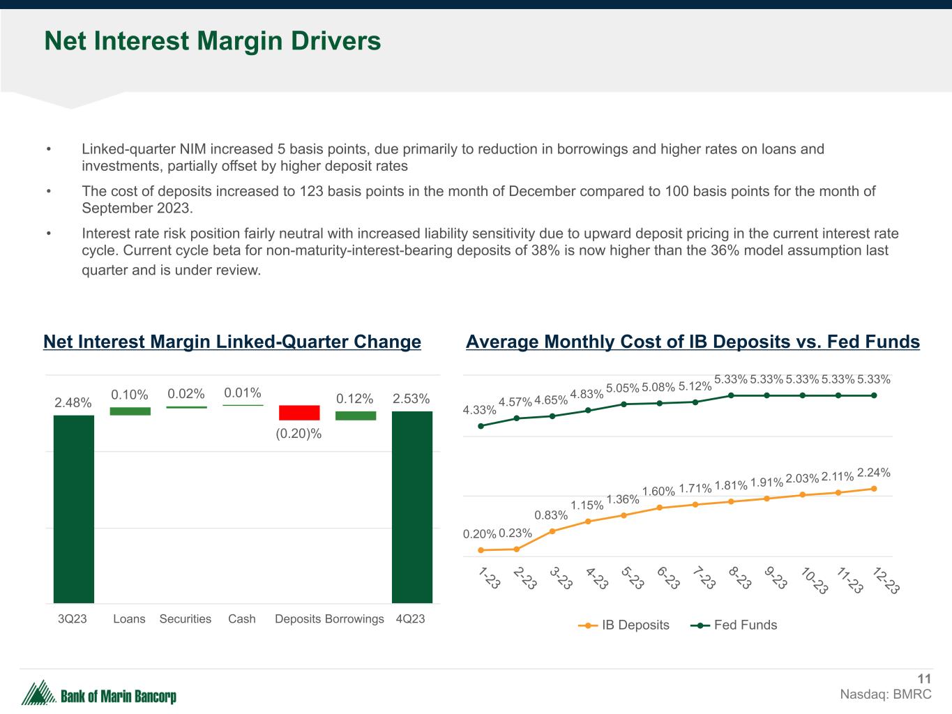 Tax Equivalent Net Interest Margin 10 Nasdaq: BMRC 1 Peer group includes major exchange-traded Western region banks with assets of $2 billion to $10 billion. Peer data as of September 30, 2023. 2 Includes one peer bank with a unique business model and a NIM of 7.1% in Q1, 7.6% in Q2 and in Q3. Excluding this bank, the median NIM would have been 3.91% in Q1, 3.56% in Q2 and 3.57% in Q3. 1 3.90% 3.98% 3.55% 3.17% 3.11% 3.04% 2.45% 2.48% 2.53% 4.19% 4.16% 3.58% 3.36% 3.66% 3.97% 3.66% 3.57% Bank of Marin Bancorp Peer Group Median 2018 2019 2020 2021 2022 Q1'23 Q2'23 Q3'23 Q4'23 2.00% 2.50% 3.00% 3.50% 4.00% 4.50% 2 2 2 Balance Sheet Repositioning