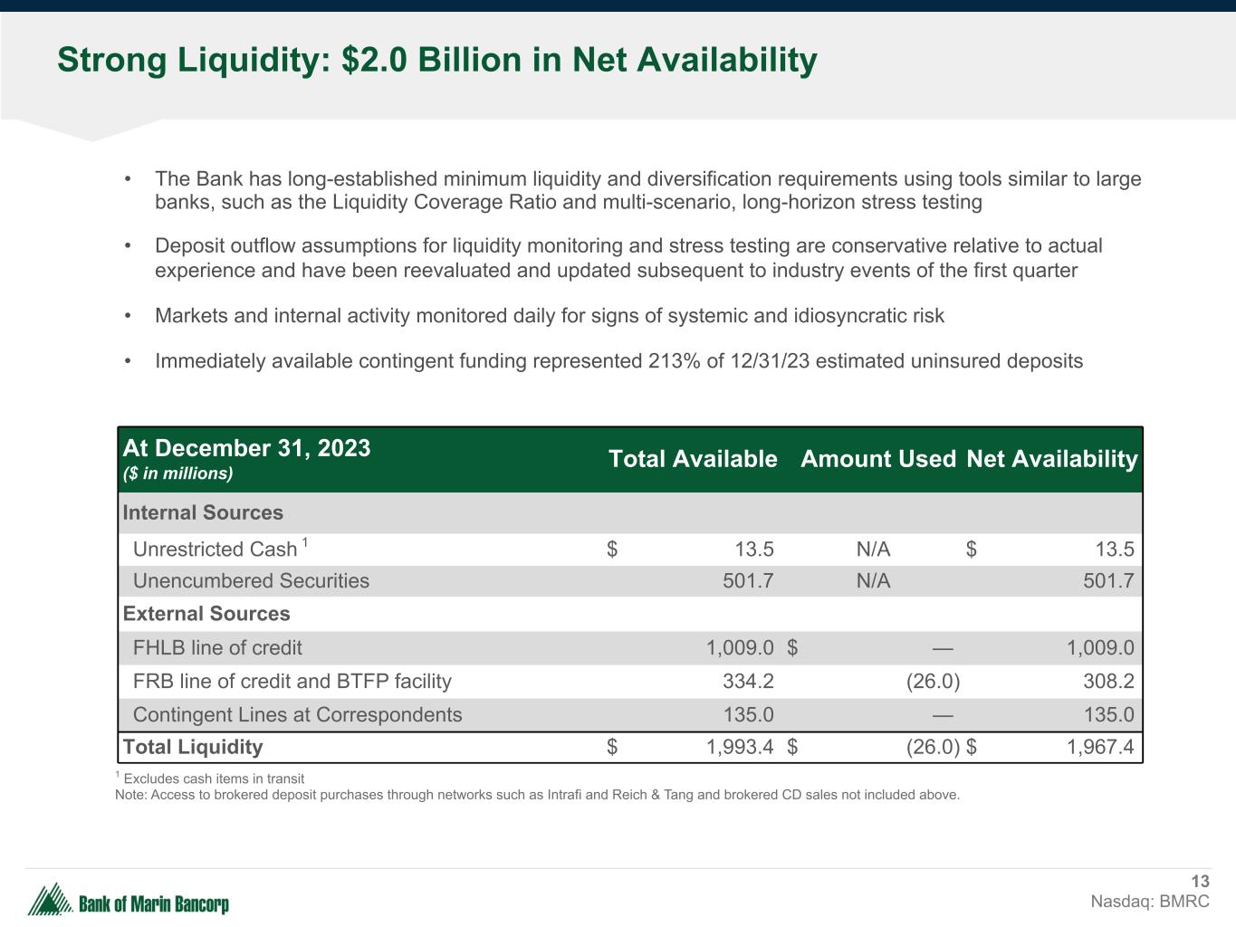 HTM Securities Portfolio Agency MBS/CMO 74% GSEs 16% Municipal Bonds 7% Corporate Bonds 3% AFS Securities Portfolio Agency MBS/CMO 64% GSEs 12% Municipal Bonds 17% SBA 3% Corporate Bonds & Other 2% USTs 2% High-Quality Securities Portfolio Generates Cash Flow Data as of 12/31/23 12 Nasdaq: BMRC $552.0MM $925.2MM Average Yield2 — 2.05% Approx. Effective Duration — 4.37 Unrealized Losses (after tax) — $43.3 million TCE Bancorp — 9.7% Average Yield — 2.47% Approx. Effective Duration — 5.72 Unrealized Losses (after tax) — $77.7 million TCE Bancorp w/ HTM — 7.8% 1 ($ in millions at Cost) 1 See Reconciliation of Non-GAAP Financial Measures in the Appendix 2 Taxable equivalent. ($ in millions at Fair Value)