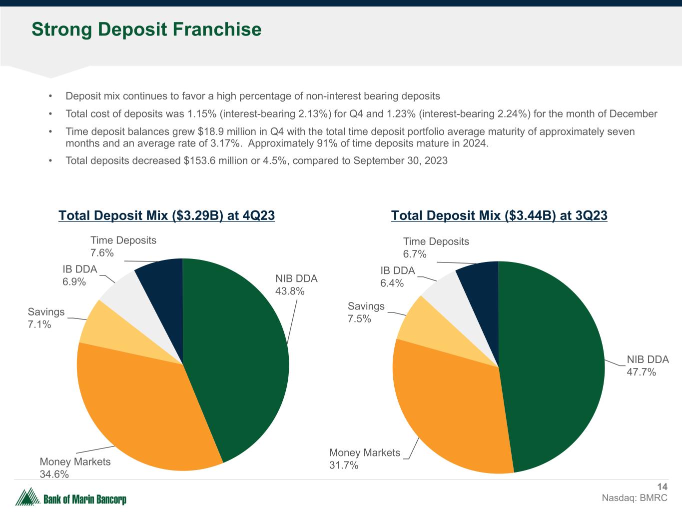 Strong Liquidity: $2.0 Billion in Net Availability 13 Nasdaq: BMRC At December 31, 2023 ($ in millions) Total Available Amount Used Net Availability Internal Sources Unrestricted Cash 1 $ 13.5 N/A $ 13.5 Unencumbered Securities 501.7 N/A 501.7 External Sources FHLB line of credit 1,009.0 $ — 1,009.0 FRB line of credit and BTFP facility 334.2 (26.0) 308.2 Contingent Lines at Correspondents 135.0 — 135.0 Total Liquidity $ 1,993.4 $ (26.0) $ 1,967.4 • The Bank has long-established minimum liquidity and diversification requirements using tools similar to large banks, such as the Liquidity Coverage Ratio and multi-scenario, long-horizon stress testing • Deposit outflow assumptions for liquidity monitoring and stress testing are conservative relative to actual experience and have been reevaluated and updated subsequent to industry events of the first quarter • Markets and internal activity monitored daily for signs of systemic and idiosyncratic risk • Immediately available contingent funding represented 213% of 12/31/23 estimated uninsured deposits 1 Excludes cash items in transit Note: Access to brokered deposit purchases through networks such as Intrafi and Reich & Tang and brokered CD sales not included above.