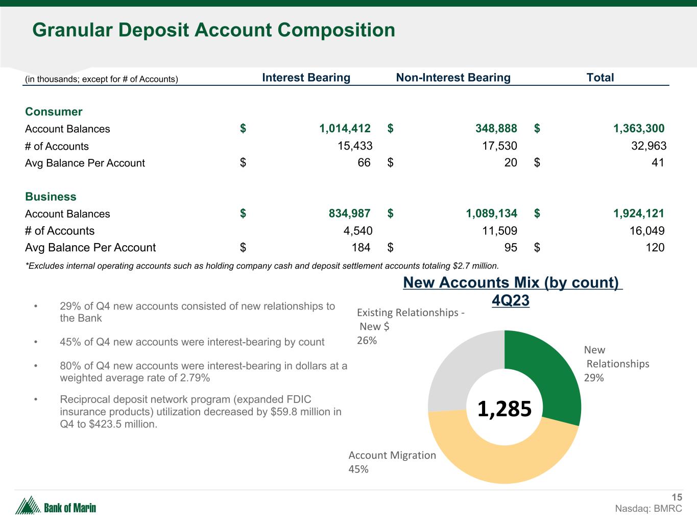 Strong Deposit Franchise 14 Nasdaq: BMRC • Deposit mix continues to favor a high percentage of non-interest bearing deposits • Total cost of deposits was 1.15% (interest-bearing 2.13%) for Q4 and 1.23% (interest-bearing 2.24%) for the month of December • Time deposit balances grew $18.9 million in Q4 with the total time deposit portfolio average maturity of approximately seven months and an average rate of 3.17%. Approximately 91% of time deposits mature in 2024. • Total deposits decreased $153.6 million or 4.5%, compared to September 30, 2023 NIB DDA 43.8% Money Markets 34.6% Savings 7.1% IB DDA 6.9% Time Deposits 7.6% Total Deposit Mix ($3.29B) at 4Q23 NIB DDA 47.7% Money Markets 31.7% Savings 7.5% IB DDA 6.4% Time Deposits 6.7% Total Deposit Mix ($3.44B) at 3Q23