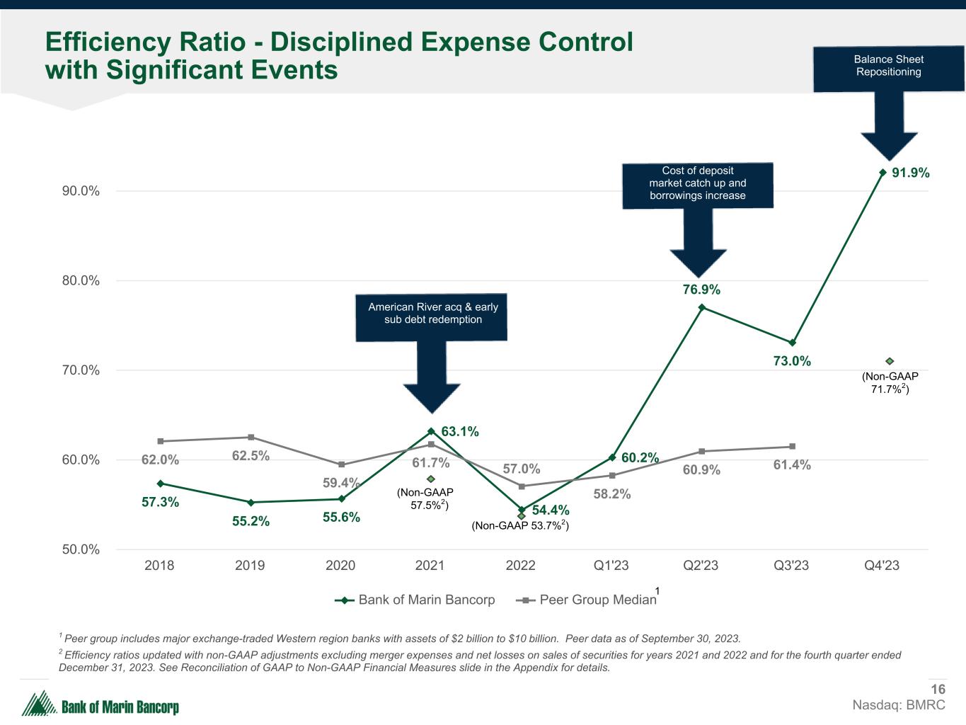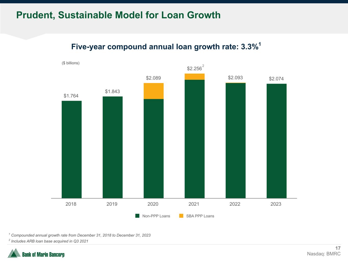 Efficiency Ratio - Disciplined Expense Control with Significant Events 16 Nasdaq: BMRC 1 Peer group includes major exchange-traded Western region banks with assets of $2 billion to $10 billion. Peer data as of September 30, 2023. 2 Efficiency ratios updated with non-GAAP adjustments excluding merger expenses and net losses on sales of securities for years 2021 and 2022 and for the fourth quarter ended December 31, 2023. See Reconciliation of GAAP to Non-GAAP Financial Measures slide in the Appendix for details. 57.3% 55.2% 55.6% 63.1% 54.4% 60.2% 76.9% 73.0% 91.9% 62.0% 62.5% 59.4% 61.7% 57.0% 58.2% 60.9% 61.4% Bank of Marin Bancorp Peer Group Median 2018 2019 2020 2021 2022 Q1'23 Q2'23 Q3'23 Q4'23 50.0% 60.0% 70.0% 80.0% 90.0% American River acq & early sub debt redemption Cost of deposit market catch up and borrowings increase Balance Sheet Repositioning 1 (Non-GAAP 71.7%2) (Non-GAAP 53.7%2) (Non-GAAP 57.5%2)