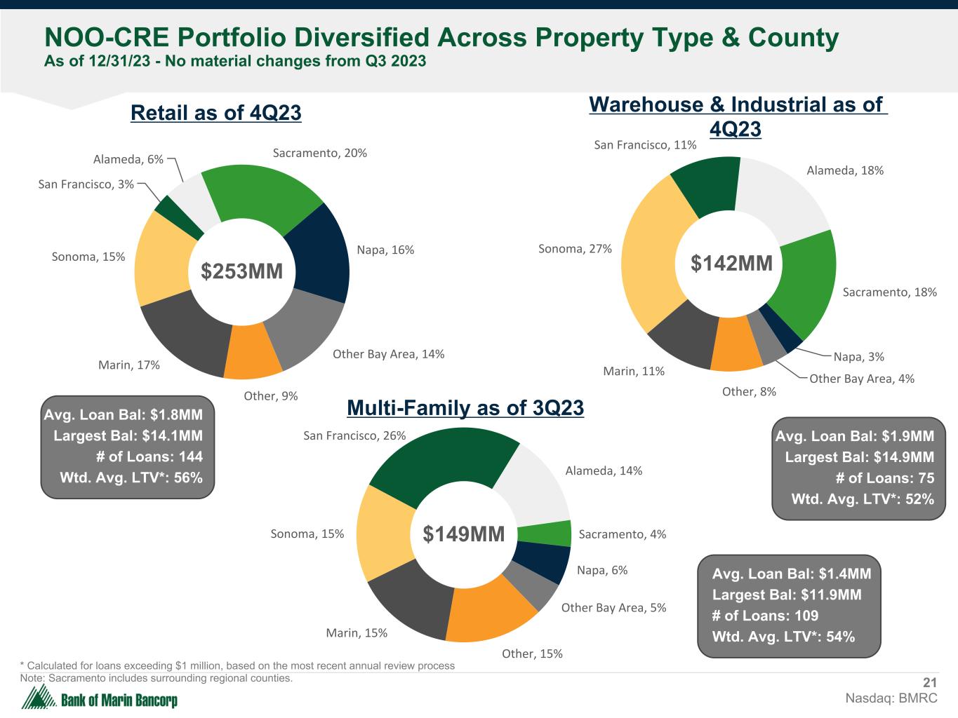 Non-owner Occupied Office Exposure As of 12/31/23 - No material changes from Q3 2023 20 Nasdaq: BMRC • $373 million in credit exposure spread across our lending footprint comprised of 153 loans • $2.4 million average loan balance – largest loan at $16.9 million • 59% weighted average loan-to-value and 1.60x weighted average debt-service coverage ratio* • City of San Francisco NOO-CRE office exposure is 3% of total loan portfolio and 6% of total NOO-CRE loans Marin, 24% Sonoma, 17% San Francisco, 19% Alameda, 6% Sacramento, 7% Napa, 10% Other Bay Area, 13% Other, 4% NOO-CRE Office Portfolio by County City of S.F. NOO-CRE Office Portfolio Total Balance: $70.7 million Average Loan Bal: $5.4 million Number of Loans: 13 loans Wtd. Average LTV*: 67% Wtd. Average DCR: 1.00x Average Occupancy: 77% 12 of the 13 loans are secured by low rise buildings and one loan is secured by a 10 story building. $373MM *Calculated for loans exceeding $1 million, based on the most recent annual review process