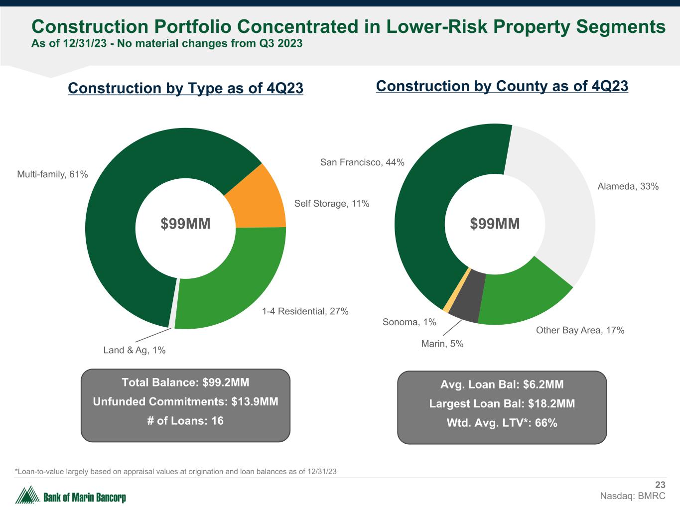 Owner-Occupied CRE Portfolio As of 12/31/23 - No material changes from Q3 2023 22 Nasdaq: BMRC Alameda, 15% Marin, 21% Napa, 17% Sacramento, 18% Sonoma, 10% Other, 19% OO CRE by Type as of 4Q23 OO CRE by County as of 4Q23 Office, 19% Industrial, 23% Retail, 7% School, 15% Wine, 11% Church, 6% Gas station/auto, 4% Heath club, 2% Mixed use, 3% Other, 10% Total Balance: $333.2MM # of Loans: 309 Avg. Loan Bal: $1.1MM Largest Loan Bal: $15.6MM Wtd. Avg. LTV*: 44% *Loan-to-value largely based on appraisal values at origination and loan balances as of 12/31/23 $333MM $333MM