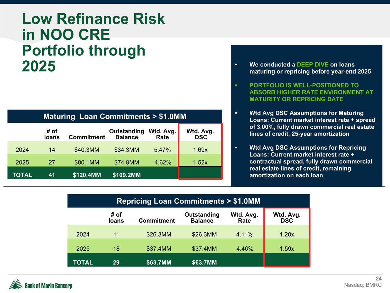 Construction Portfolio Concentrated in Lower-Risk Property Segments As of 12/31/23 - No material changes from Q3 2023 23 Nasdaq: BMRC Marin, 5% Sonoma, 1% San Francisco, 44% Alameda, 33% Other Bay Area, 17% Construction by Type as of 4Q23 Construction by County as of 4Q23 Multi-family, 61% Self Storage, 11% 1-4 Residential, 27% Land & Ag, 1% Total Balance: $99.2MM Unfunded Commitments: $13.9MM # of Loans: 16 Avg. Loan Bal: $6.2MM Largest Loan Bal: $18.2MM Wtd. Avg. LTV*: 66% $99MM $99MM *Loan-to-value largely based on appraisal values at origination and loan balances as of 12/31/23