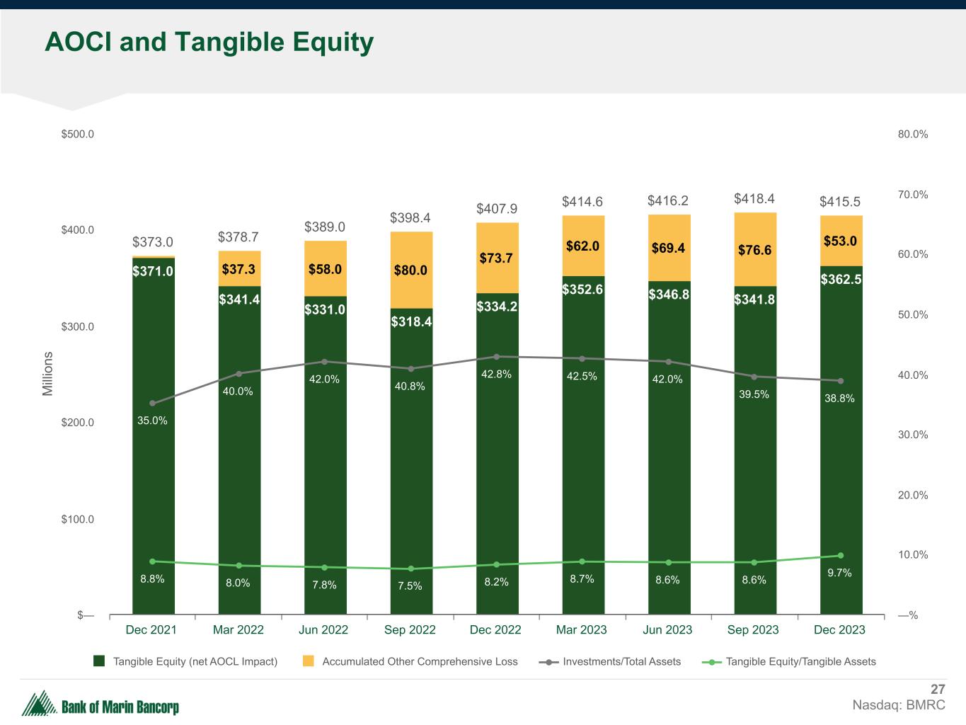 6.5% 8.0% 10.0% 5.0% 15.9% 15.9% 16.9% 10.5% 9.7% 7.8% Well Capitalized Threshold Bank of Marin Bancorp Bancorp TCE adj. for HTM securities* Common Equity Tier-One Risk-Based Capital Total Tier-One Risk-Based Capital Total Risk-Based Capital Tier-One Leverage Tangible Common Equity *See Reconciliation of Non-GAAP Financial Measures in the Appendix. 26 Nasdaq: BMRC Robust Capital Ratios As of 12/31/23