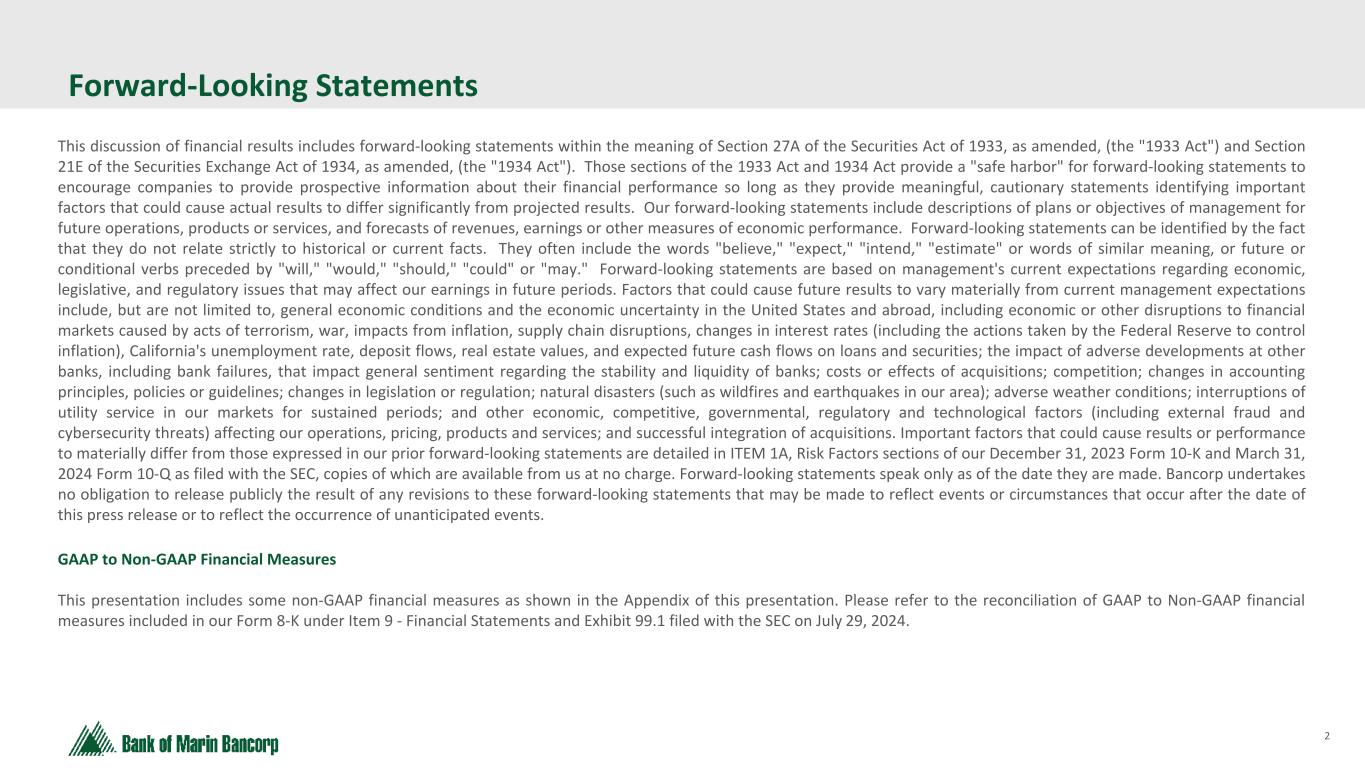 2 Text 95,96,96 Light Gray 232, 232, 232 Black 0, 0, 0 White 255, 255, 255 Accent 1 7,89,52 Accent 2 248,153,40 Accent 3 254,217,129 Accent 4 52,153,70 Accent 5 5,39,67 Accent 6 171,184,195 Forward-Looking Statements This discussion of financial results includes forward-looking statements within the meaning of Section 27A of the Securities Act of 1933, as amended, (the "1933 Act") and Section 21E of the Securities Exchange Act of 1934, as amended, (the "1934 Act"). Those sections of the 1933 Act and 1934 Act provide a "safe harbor" for forward-looking statements to encourage companies to provide prospective information about their financial performance so long as they provide meaningful, cautionary statements identifying important factors that could cause actual results to differ significantly from projected results. Our forward-looking statements include descriptions of plans or objectives of management for future operations, products or services, and forecasts of revenues, earnings or other measures of economic performance. Forward-looking statements can be identified by the fact that they do not relate strictly to historical or current facts. They often include the words "believe," "expect," "intend," "estimate" or words of similar meaning, or future or conditional verbs preceded by "will," "would," "should," "could" or "may." Forward-looking statements are based on management's current expectations regarding economic, legislative, and regulatory issues that may affect our earnings in future periods. Factors that could cause future results to vary materially from current management expectations include, but are not limited to, general economic conditions and the economic uncertainty in the United States and abroad, including economic or other disruptions to financial markets caused by acts of terrorism, war, impacts from inflation, supply chain disruptions, changes in interest rates (including the actions taken by the Federal Reserve to control inflation), California's unemployment rate, deposit flows, real estate values, and expected future cash flows on loans and securities; the impact of adverse developments at other banks, including bank failures, that impact general sentiment regarding the stability and liquidity of banks; costs or effects of acquisitions; competition; changes in accounting principles, policies or guidelines; changes in legislation or regulation; natural disasters (such as wildfires and earthquakes in our area); adverse weather conditions; interruptions of utility service in our markets for sustained periods; and other economic, competitive, governmental, regulatory and technological factors (including external fraud and cybersecurity threats) affecting our operations, pricing, products and services; and successful integration of acquisitions. Important factors that could cause results or performance to materially differ from those expressed in our prior forward-looking statements are detailed in ITEM 1A, Risk Factors sections of our December 31, 2023 Form 10-K and March 31, 2024 Form 10-Q as filed with the SEC, copies of which are available from us at no charge. Forward-looking statements speak only as of the date they are made. Bancorp undertakes no obligation to release publicly the result of any revisions to these forward-looking statements that may be made to reflect events or circumstances that occur after the date of this press release or to reflect the occurrence of unanticipated events. GAAP to Non-GAAP Financial Measures This presentation includes some non-GAAP financial measures as shown in the Appendix of this presentation. Please refer to the reconciliation of GAAP to Non-GAAP financial measures included in our Form 8-K under Item 9 - Financial Statements and Exhibit 99.1 filed with the SEC on July 29, 2024.