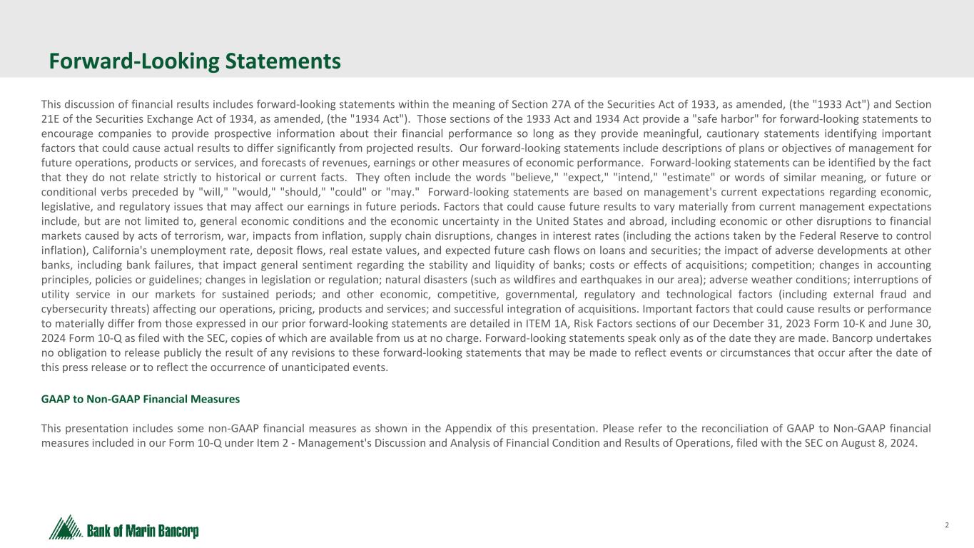2 Text 95,96,96 Light Gray 232, 232, 232 Black 0, 0, 0 White 255, 255, 255 Accent 1 7,89,52 Accent 2 248,153,40 Accent 3 254,217,129 Accent 4 52,153,70 Accent 5 5,39,67 Accent 6 171,184,195 Forward-Looking Statements This discussion of financial results includes forward-looking statements within the meaning of Section 27A of the Securities Act of 1933, as amended, (the "1933 Act") and Section 21E of the Securities Exchange Act of 1934, as amended, (the "1934 Act"). Those sections of the 1933 Act and 1934 Act provide a "safe harbor" for forward-looking statements to encourage companies to provide prospective information about their financial performance so long as they provide meaningful, cautionary statements identifying important factors that could cause actual results to differ significantly from projected results. Our forward-looking statements include descriptions of plans or objectives of management for future operations, products or services, and forecasts of revenues, earnings or other measures of economic performance. Forward-looking statements can be identified by the fact that they do not relate strictly to historical or current facts. They often include the words "believe," "expect," "intend," "estimate" or words of similar meaning, or future or conditional verbs preceded by "will," "would," "should," "could" or "may." Forward-looking statements are based on management's current expectations regarding economic, legislative, and regulatory issues that may affect our earnings in future periods. Factors that could cause future results to vary materially from current management expectations include, but are not limited to, general economic conditions and the economic uncertainty in the United States and abroad, including economic or other disruptions to financial markets caused by acts of terrorism, war, impacts from inflation, supply chain disruptions, changes in interest rates (including the actions taken by the Federal Reserve to control inflation), California's unemployment rate, deposit flows, real estate values, and expected future cash flows on loans and securities; the impact of adverse developments at other banks, including bank failures, that impact general sentiment regarding the stability and liquidity of banks; costs or effects of acquisitions; competition; changes in accounting principles, policies or guidelines; changes in legislation or regulation; natural disasters (such as wildfires and earthquakes in our area); adverse weather conditions; interruptions of utility service in our markets for sustained periods; and other economic, competitive, governmental, regulatory and technological factors (including external fraud and cybersecurity threats) affecting our operations, pricing, products and services; and successful integration of acquisitions. Important factors that could cause results or performance to materially differ from those expressed in our prior forward-looking statements are detailed in ITEM 1A, Risk Factors sections of our December 31, 2023 Form 10-K and June 30, 2024 Form 10-Q as filed with the SEC, copies of which are available from us at no charge. Forward-looking statements speak only as of the date they are made. Bancorp undertakes no obligation to release publicly the result of any revisions to these forward-looking statements that may be made to reflect events or circumstances that occur after the date of this press release or to reflect the occurrence of unanticipated events. GAAP to Non-GAAP Financial Measures This presentation includes some non-GAAP financial measures as shown in the Appendix of this presentation. Please refer to the reconciliation of GAAP to Non-GAAP financial measures included in our Form 10-Q under Item 2 - Management's Discussion and Analysis of Financial Condition and Results of Operations, filed with the SEC on August 8, 2024.