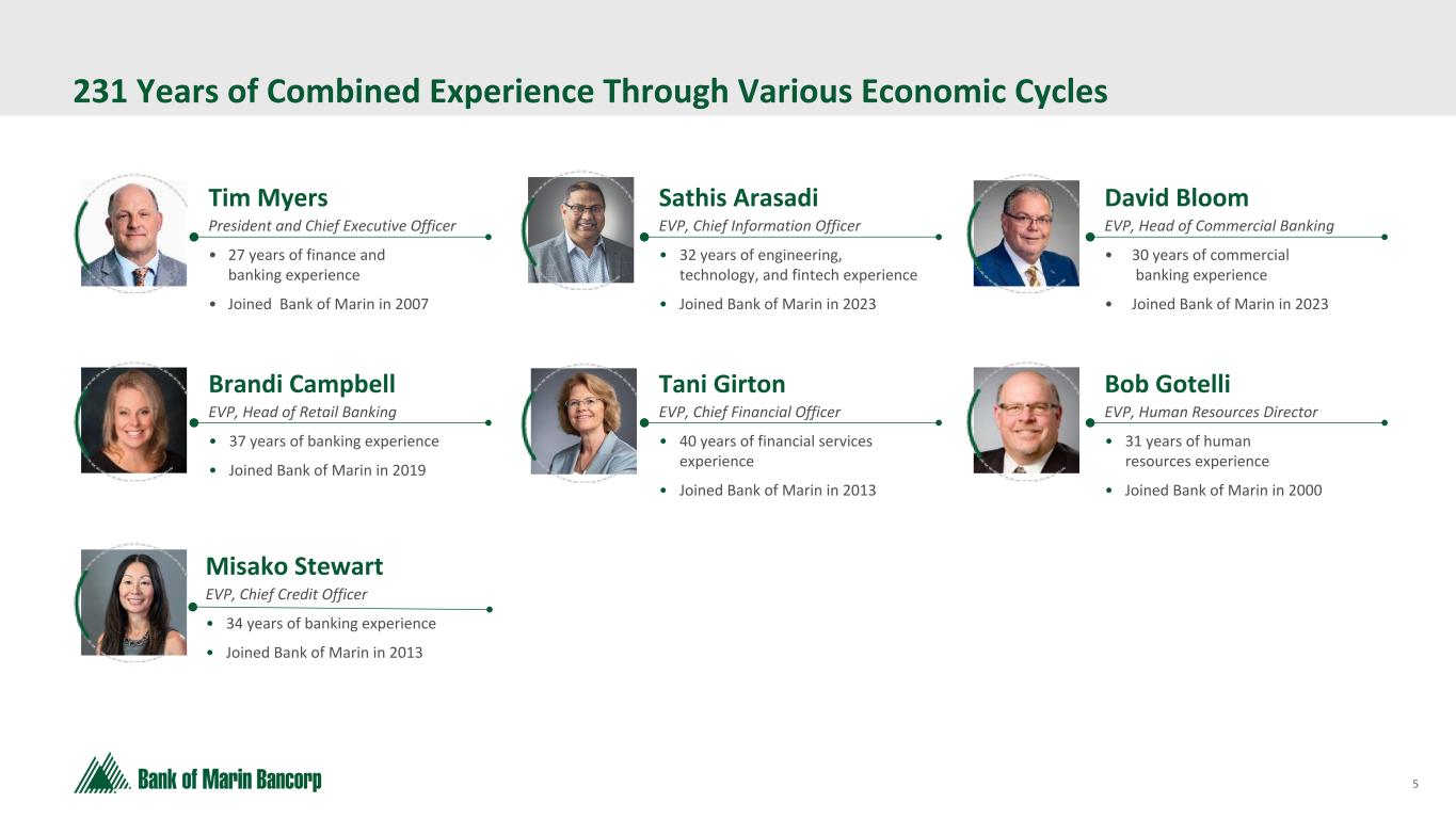 4 Text 95,96,96 Light Gray 232, 232, 232 Black 0, 0, 0 White 255, 255, 255 Accent 1 7,89,52 Accent 2 248,153,40 Accent 3 254,217,129 Accent 4 52,153,70 Accent 5 5,39,67 Accent 6 171,184,195 Bank of Marin Bancorp Novato, CA Headquarters BMRC NASDAQ $263.5 Million Market Cap $3.7 Billion Total Assets 6.18% Dividend Yield 16.46% Total RBC BMRC AT A GLANCE Data as of June 30, 2024 Relationship Banking Build strong, long-term customer relationships based on trust, integrity and expertise, inspiring loyalty though exceptional service. Disciplined Fundamentals Apply a disciplined business approach with sound banking practices, high quality products, and consistent fundamentals ensuring continued strong results. Community Commitment Give back to the communities that we serve through active employee volunteerism, nonprofit board leadership and financial contributions. 27 Branch Locations 7 Commercial Banking Offices