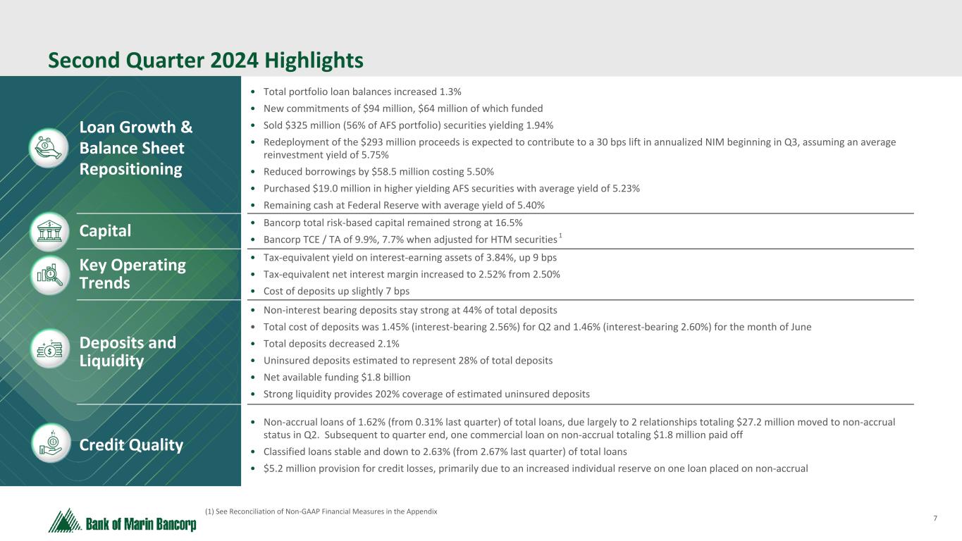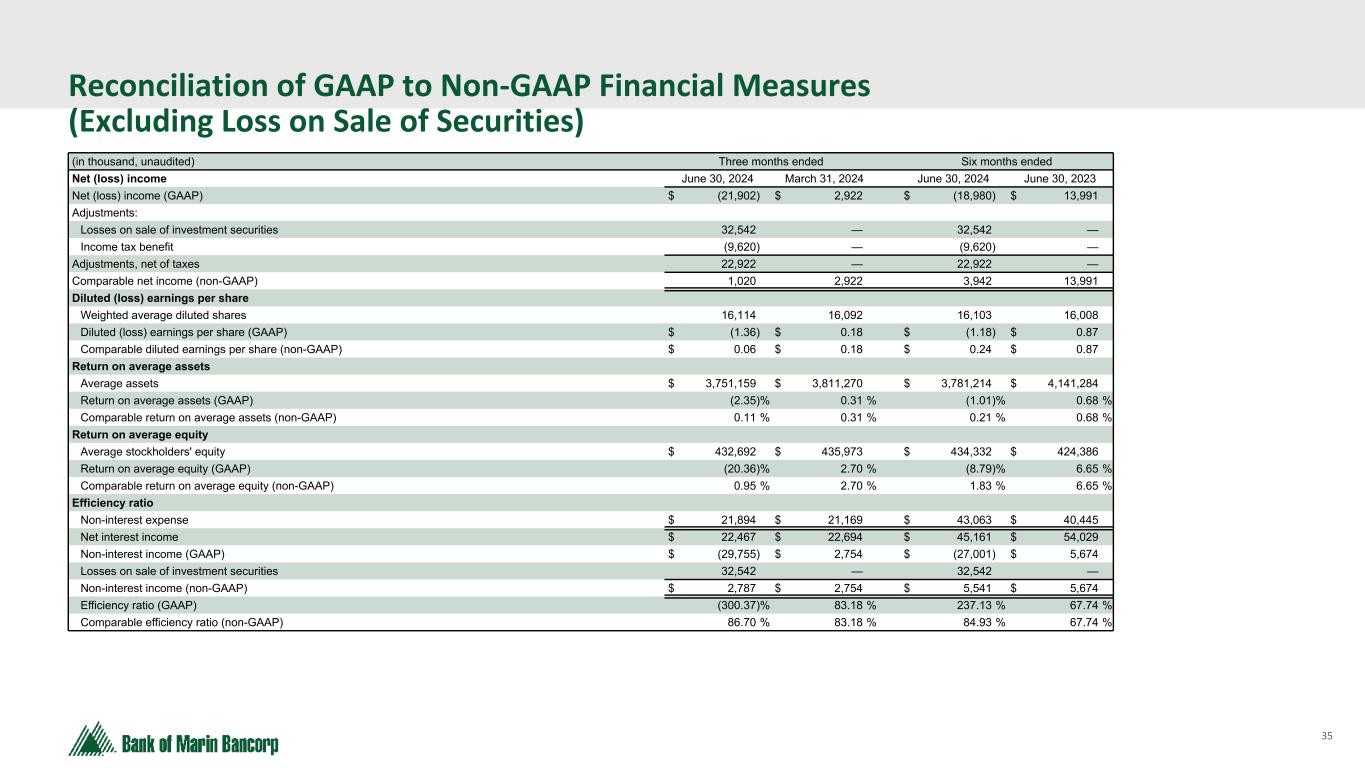 35 Text 95,96,96 Light Gray 232, 232, 232 Black 0, 0, 0 White 255, 255, 255 Accent 1 7,89,52 Accent 2 248,153,40 Accent 3 254,217,129 Accent 4 52,153,70 Accent 5 5,39,67 Accent 6 171,184,195 Reconciliation of GAAP to Non-GAAP Financial Measures (Excluding Loss on Sale of Securities) (in thousand, unaudited) Three months ended Six months ended Net (loss) income June 30, 2024 March 31, 2024 June 30, 2024 June 30, 2023 Net (loss) income (GAAP) $ (21,902) $ 2,922 $ (18,980) $ 13,991 Adjustments: Losses on sale of investment securities 32,542 — 32,542 — Income tax benefit (9,620) — (9,620) — Adjustments, net of taxes 22,922 — 22,922 — Comparable net income (non-GAAP) 1,020 2,922 3,942 13,991 Diluted (loss) earnings per share Weighted average diluted shares 16,114 16,092 16,103 16,008 Diluted (loss) earnings per share (GAAP) $ (1.36) $ 0.18 $ (1.18) $ 0.87 Comparable diluted earnings per share (non-GAAP) $ 0.06 $ 0.18 $ 0.24 $ 0.87 Return on average assets Average assets $ 3,751,159 $ 3,811,270 $ 3,781,214 $ 4,141,284 Return on average assets (GAAP) (2.35) % 0.31 % (1.01) % 0.68 % Comparable return on average assets (non-GAAP) 0.11 % 0.31 % 0.21 % 0.68 % Return on average equity Average stockholders' equity $ 432,692 $ 435,973 $ 434,332 $ 424,386 Return on average equity (GAAP) (20.36) % 2.70 % (8.79) % 6.65 % Comparable return on average equity (non-GAAP) 0.95 % 2.70 % 1.83 % 6.65 % Efficiency ratio Non-interest expense $ 21,894 $ 21,169 $ 43,063 $ 40,445 Net interest income $ 22,467 $ 22,694 $ 45,161 $ 54,029 Non-interest income (GAAP) $ (29,755) $ 2,754 $ (27,001) $ 5,674 Losses on sale of investment securities 32,542 — 32,542 — Non-interest income (non-GAAP) $ 2,787 $ 2,754 $ 5,541 $ 5,674 Efficiency ratio (GAAP) (300.37) % 83.18 % 237.13 % 67.74 % Comparable efficiency ratio (non-GAAP) 86.70 % 83.18 % 84.93 % 67.74 %