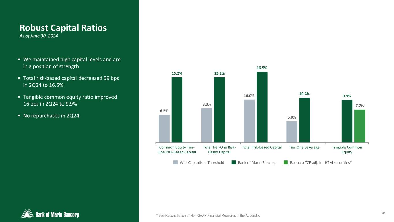 9 Text 95,96,96 Light Gray 232, 232, 232 Black 0, 0, 0 White 255, 255, 255 Accent 1 7,89,52 Accent 2 248,153,40 Accent 3 254,217,129 Accent 4 52,153,70 Accent 5 5,39,67 Accent 6 171,184,195 Focused on delivering Long-Term, Consistent Growth • Proven ability to grow both organically and through M&A • Consistent cash dividend provides stable and reliable return for shareholders Note: Tangible book value per share (TBVPS) equals total shareholders’ equity, less intangible assets including goodwill and core deposit intangibles, divided by outstanding common shares at period end. Accumulated other comprehensive income (AOCI) represents the unrealized gains (losses) on available-for-sale securities, net of tax. Components of these calculations were derived from our financial reports filed with the SEC for each respective period. Additional information for Q2 2024 can be found in the Reconciliation of Non-GAAP Financial Measures in the Appendix. Tangible Book Value Per Share and Cumulative Cash Dividends $0.37 $0.77 $1.22 $1.73 $2.29 $2.92 $3.72 $4.64 $5.58 $6.56 $7.56 $8.06 $14.51 $15.89 $16.87 $18.35 $18.99 $20.57 $21.91 $23.09 $23.42 $25.45 $25.72 $23.97 Cumulative Cash Dividends TBVPS TBVPS (Excl AOCI) 2013 2014 2015 2016 2017 2018 2019 2020 2021 2022 2023 2Q24 $— $5.00 $10.00 $15.00 $20.00 $25.00 $30.00