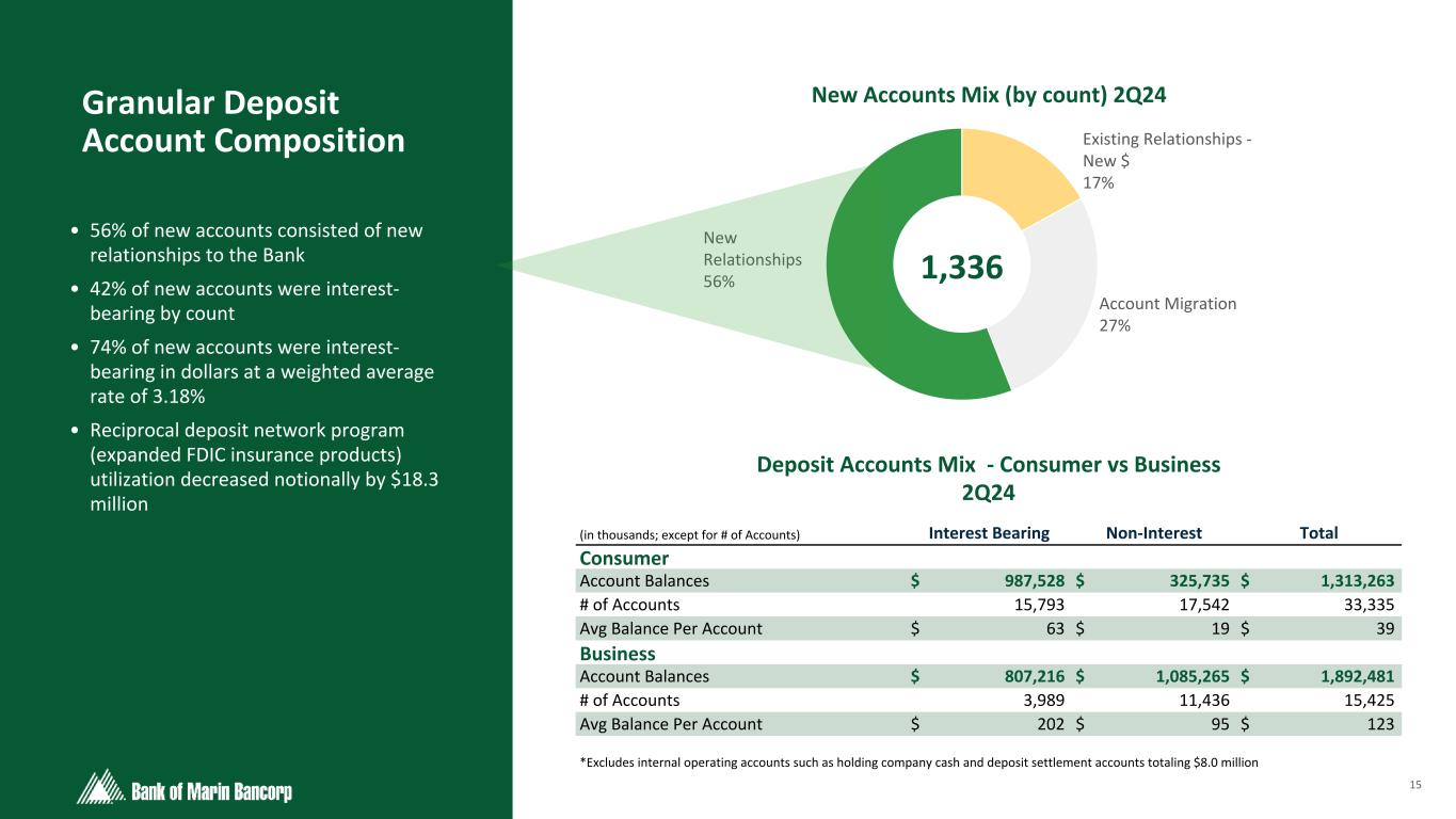 14 Text 95,96,96 Light Gray 232, 232, 232 Black 0, 0, 0 White 255, 255, 255 Accent 1 7,89,52 Accent 2 248,153,40 Accent 3 254,217,129 Accent 4 52,153,70 Accent 5 5,39,67 Accent 6 171,184,195 Strong Deposit Franchise • Deposit mix continues to favor a high percentage of non-interest bearing deposits • Total cost of deposits was 1.45% (interest-bearing 2.56%) for Q2 and 1.46% (interest-bearing 2.60%) for the month of June • Our time deposits are not derived from brokered CD markets or advertised CD specials Total Deposit Mix at 2Q24Total Deposits ($ in millions) $2,337 $2,504 $3,808 $3,574 $3,290 $3,214 $1,271 $1,538 $2,201 $2,127 $1,667 $1,597 $968 $869 $1,457 $1,328 $1,372 $1,350$98 $97 $150 $119 $251 $267 Transaction Savings & MMDA Time 2019 2020 2021 2022 2023 2Q24 Non-Interest Bearing 44.1% IB DDA 5.6% Savings 7.1% Money Market 34.9% Time 8.3% $3.21B