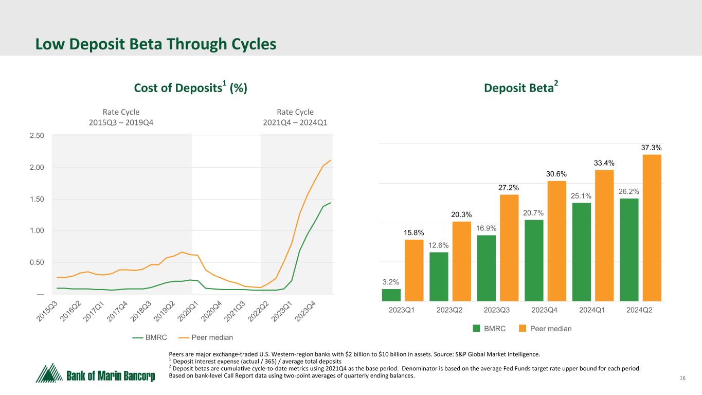 15 Text 95,96,96 Light Gray 232, 232, 232 Black 0, 0, 0 White 255, 255, 255 Accent 1 7,89,52 Accent 2 248,153,40 Accent 3 254,217,129 Accent 4 52,153,70 Accent 5 5,39,67 Accent 6 171,184,195 New Accounts Mix (by count) 2Q24Granular Deposit Account Composition Existing Relationships - New $ 17% Account Migration 27% New Relationships 56% 1,336 (in thousands; except for # of Accounts) Interest Bearing Non-Interest Bearing Total Consumer Account Balances $ 987,528 $ 325,735 $ 1,313,263 # of Accounts 15,793 17,542 33,335 Avg Balance Per Account $ 63 $ 19 $ 39 Business Account Balances $ 807,216 $ 1,085,265 $ 1,892,481 # of Accounts 3,989 11,436 15,425 Avg Balance Per Account $ 202 $ 95 $ 123 *Excludes internal operating accounts such as holding company cash and deposit settlement accounts totaling $8.0 million Deposit Accounts Mix - Consumer vs Business 2Q24 • 56% of new accounts consisted of new relationships to the Bank • 42% of new accounts were interest- bearing by count • 74% of new accounts were interest- bearing in dollars at a weighted average rate of 3.18% • Reciprocal deposit network program (expanded FDIC insurance products) utilization decreased notionally by $18.3 million
