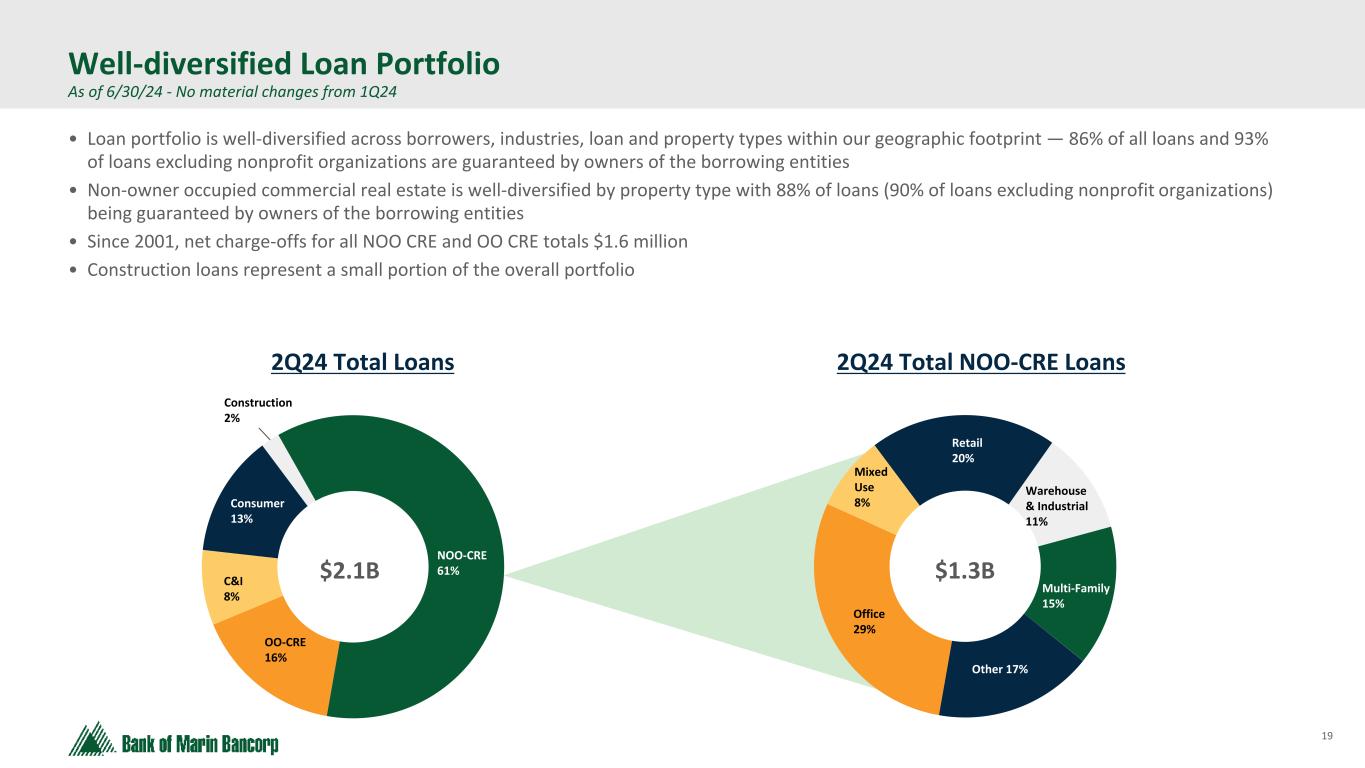 18 Text 95,96,96 Light Gray 232, 232, 232 Black 0, 0, 0 White 255, 255, 255 Accent 1 7,89,52 Accent 2 248,153,40 Accent 3 254,217,129 Accent 4 52,153,70 Accent 5 5,39,67 Accent 6 171,184,195 • Loan originations were at yields higher than those on paid off loans • Notable pipeline growth and diversification from key hires and enhanced compensation and calling programs • Sound underwriting produces a high- quality loan portfolio with low credit costs and stable earnings through cycles • Extending credit and serving the needs of existing clients while ensuring new opportunities present the appropriate levels of risk and return Prudent, Sustainable Model for Loan Growth $1.843 $2.089 $2.256 $2.093 $2.074 $2.082 4.73% 4.15% 4.23% 4.29% 4.65% 4.84% Non-PPP Loans SBA PPP Loans Average Annual Yield on Loans 2019 2020 2021 2022 2023 2Q2024 Five-year compound annual loan growth rate: 3.4%1 Total Loans ($ in billions) 1 Compounded annual growth rate from June 30, 2019 to June 30, 2024 2 Includes ARB loans acquired in 3Q21 2