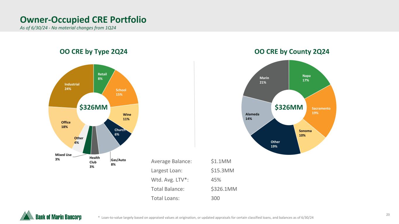 22 Text 95,96,96 Light Gray 232, 232, 232 Black 0, 0, 0 White 255, 255, 255 Accent 1 7,89,52 Accent 2 248,153,40 Accent 3 254,217,129 Accent 4 52,153,70 Accent 5 5,39,67 Accent 6 171,184,195 * Calculated for loans exceeding $1 million, based on the most recent annual review process Note: Sacramento includes surrounding regional counties. NOO CRE Portfolio Diversified Across Property Type & County As of 6/30/24 - No material changes from 1Q24 Average Balance: $1.7MM Largest Balance: $13.9MM Total # of Loans: 141 Wtd. Avg. LTV*: 60% Average Balance: $1.9MM Largest Balance: $14.7MM Total # of Loans: 74 Wtd. Avg. LTV*: 55% Average Balance: $1.7MM Largest Balance: $21.7MM Total # of Loans: 116 Wtd. Avg. LTV*: 59% San Francisco 3% Alameda 5% Sacramento 19% Napa 17% Other Bay Area 15% Other 9% Marin 17% Sonoma 15% San Francisco 11% Alameda 18% Sacramento 18% Napa 3% Other Bay Area 4% Other 8% Marin 11% Sonoma 27% San Francisco 30% Alameda 22% Sacramento 3% Napa 6% Other Bay Area 4% Other 11% Marin 11% Sonoma 13% Retail 2Q24 Warehouse & Industrial 2Q24 Multifamily 2Q24 $246MM $140MM $193MM