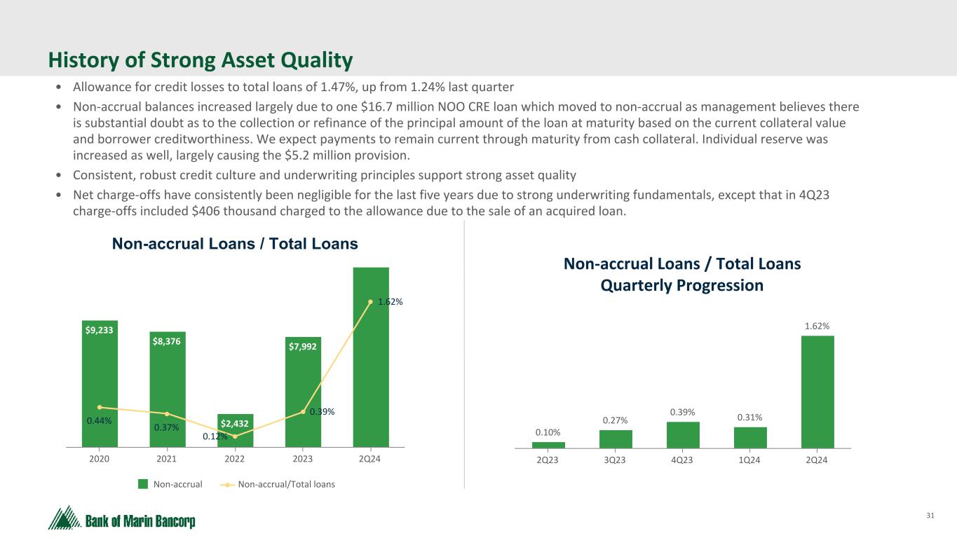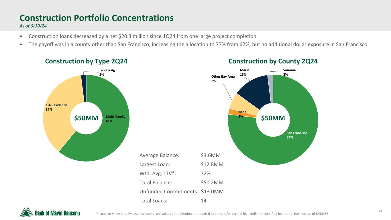 24 Text 95,96,96 Light Gray 232, 232, 232 Black 0, 0, 0 White 255, 255, 255 Accent 1 7,89,52 Accent 2 248,153,40 Accent 3 254,217,129 Accent 4 52,153,70 Accent 5 5,39,67 Accent 6 171,184,195 ($ in millions at Fair Value) * Loan-to-value largely based on appraised values at origination, or updated appraisals for certain high dollar or classified loans and, balances as of 6/30/24 Construction Portfolio Concentrations As of 6/30/24 Construction by Type 2Q24 Construction by County 2Q24 Multi-Family 61% 1-4 Residential 37% Land & Ag. 2% San Francisco 77% Napa 2% Other Bay Area 6% Marin 13% Sonoma 2% Average Balance: $3.6MM Largest Loan: $12.8MM Wtd. Avg. LTV*: 72% Total Balance: $50.2MM Unfunded Commitments: $13.0MM Total Loans: 14 $50MM $50MM • Construction loans decreased by a net $20.3 million since 1Q24 from one large project completion • The payoff was in a county other than San Francisco, increasing the allocation to 77% from 62%, but no additional dollar exposure in San Francisco