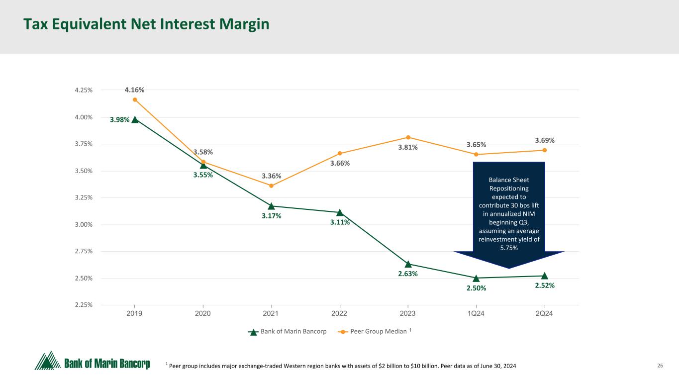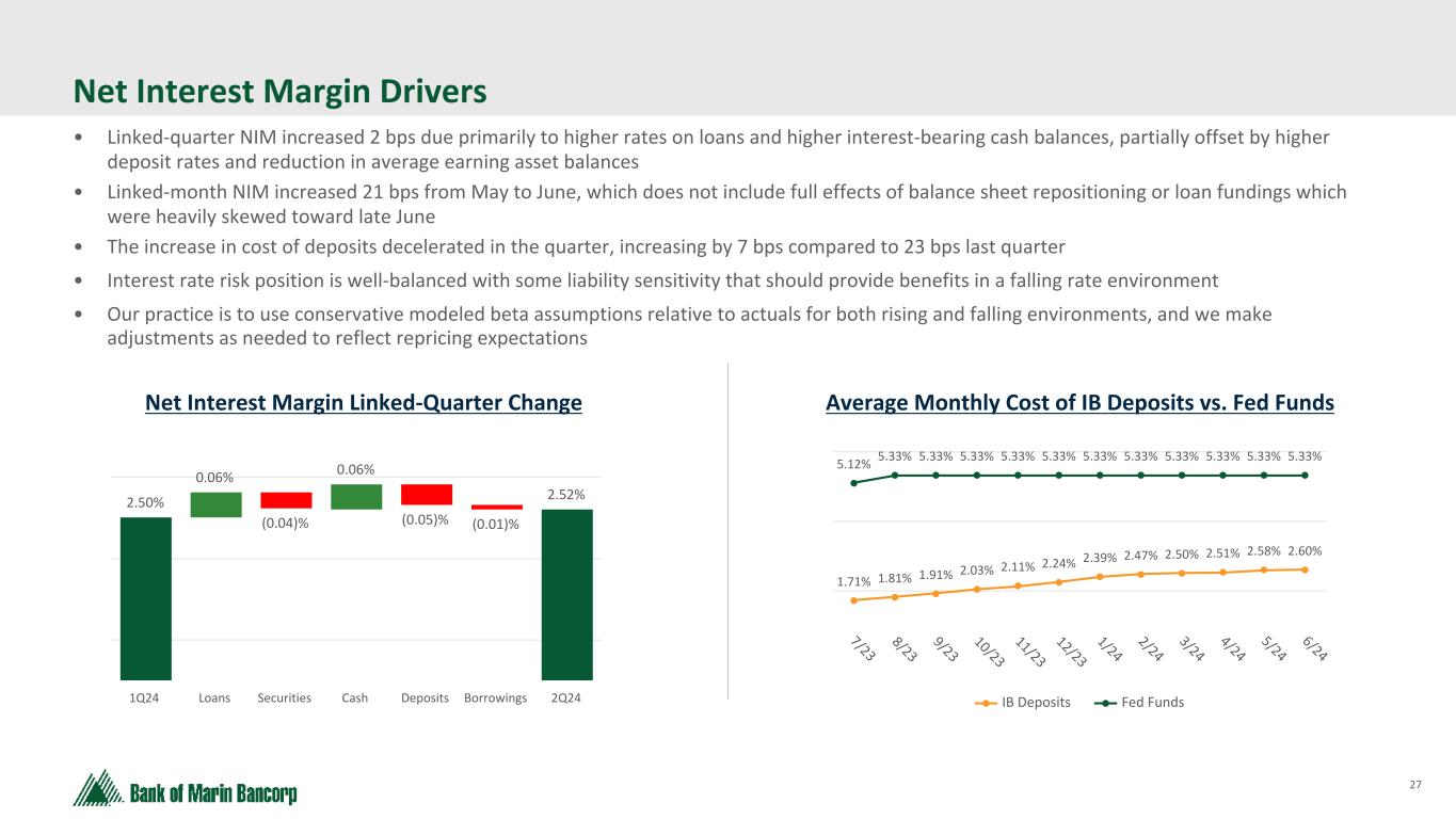 26 Text 95,96,96 Light Gray 232, 232, 232 Black 0, 0, 0 White 255, 255, 255 Accent 1 7,89,52 Accent 2 248,153,40 Accent 3 254,217,129 Accent 4 52,153,70 Accent 5 5,39,67 Accent 6 171,184,195 3.98% 3.55% 3.17% 3.11% 2.63% 2.50% 2.52% 4.16% 3.58% 3.36% 3.66% 3.81% 3.65% 3.69% Bank of Marin Bancorp Peer Group Median 2019 2020 2021 2022 2023 1Q24 2Q24 2.25% 2.50% 2.75% 3.00% 3.25% 3.50% 3.75% 4.00% 4.25% Tax Equivalent Net Interest Margin 1 Peer group includes major exchange-traded Western region banks with assets of $2 billion to $10 billion. Peer data as of June 30, 2024 1 Balance Sheet Repositioning expected to contribute 30 bps lift in annualized NIM beginning Q3, assuming an average reinvestment yield of 5.75%