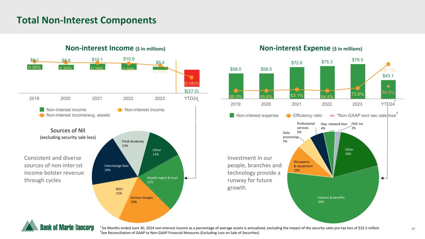 28 Text 95,96,96 Light Gray 232, 232, 232 Black 0, 0, 0 White 255, 255, 255 Accent 1 7,89,52 Accent 2 248,153,40 Accent 3 254,217,129 Accent 4 52,153,70 Accent 5 5,39,67 Accent 6 171,184,195 Loans & Securities — Repricing & Maturity $ in millions, unless otherwise indicated Total Loans1 * at June 30, 2024 Repricing Term Rate Structure 3 mo or less 3-12 mos 1-3 years 3-5 years 5-15 years Over 15 years Total Floating Rate Variable Rate Variable Rate at Floor or Ceiling Fixed Rate C&I $ 90.6 $ 5.5 $ 12.2 $ 34.5 $ 23.8 $ 2.6 $ 169.2 $ 70.4 $ 18.7 $ 6.6 $ 73.5 Real estate: Owner-occupied CRE 3.7 9.4 38.9 64.1 201.9 7.1 325.1 0.1 35.0 103.0 187.0 Non-owner occupied CRE 54.6 41.5 232.1 273.7 652.8 13.2 1,267.9 7.7 103.7 336.8 819.7 Construction 42.0 5.0 4.2 — — — 51.2 1.5 — 15.0 34.7 Home equity 87.3 — — — 0.7 — 88.0 87.3 — — 0.7 Other residential 0.3 7.1 — 0.6 1.5 104.6 114.1 — 7.7 105.1 1.3 Installment & other consumer 1.6 2.4 7.9 3.3 51.7 — 66.9 0.6 8.8 7.5 50.0 Total $ 280.1 $ 70.9 $ 295.3 $ 376.2 $ 932.4 $ 127.5 $ 2,082.4 $ 167.6 $ 173.9 $ 574.0 $ 1,166.9 % of Total 14 % 3 % 14 % 18 % 45 % 6 % 100 % 8 % 8 % 28 % 56 % Weighted Average Rate 7.80 % 5.44 % 4.77 % 5.13 % 4.25 % 3.93 % 4.99 % 1 Amounts represent amortized cost. Based on maturity date for fixed rate loans and variable rate loans at their floors and ceilings and next repricing date for all other variable rate loans. Does not included prepayment assumptions. Investment Securities2 * at June 30, 2024 2 Includes both available-for-sale and held-to-maturity investment securities with prepayment assumptions applied. Maturity & Projected Cash Flow Distribution 3 mo or less 3-12 mos 1-3 years 3-5 years 5-10 years Over 10 years Total Principal (par) & interest $ 27.5 $ 93.3 $ 260.9 $ 209.1 $ 512.2 $ 291.8 $ 1,394.8 % of Total 2 % 7 % 19 % 15 % 36 % 21 % 100 %