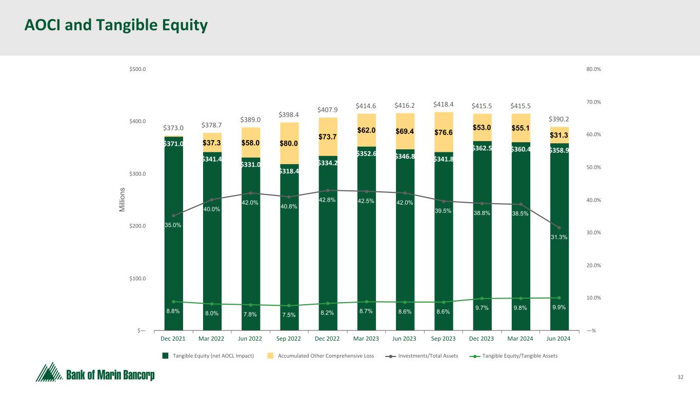 31 Text 95,96,96 Light Gray 232, 232, 232 Black 0, 0, 0 White 255, 255, 255 Accent 1 7,89,52 Accent 2 248,153,40 Accent 3 254,217,129 Accent 4 52,153,70 Accent 5 5,39,67 Accent 6 171,184,195 ($ in millions at Fair Value) History of Strong Asset Quality Non-accrual Loans / Total Loans Quarterly Progression 0.10% 0.27% 0.39% 0.31% 1.62% 2Q23 3Q23 4Q23 1Q24 2Q24 • Allowance for credit losses to total loans of 1.47%, up from 1.24% last quarter • Non-accrual balances increased largely due to one $16.7 million NOO CRE loan which moved to non-accrual as management believes there is substantial doubt as to the collection or refinance of the principal amount of the loan at maturity based on the current collateral value and borrower creditworthiness. We expect payments to remain current through maturity from cash collateral. Individual reserve was increased as well, largely causing the $5.2 million provision. • Consistent, robust credit culture and underwriting principles support strong asset quality • Net charge-offs have consistently been negligible for the last five years due to strong underwriting fundamentals, except that in 4Q23 charge-offs included $406 thousand charged to the allowance due to the sale of an acquired loan. Non-accrual Loans / Total Loans $9,233 $8,376 $2,432 $7,992 0.44% 0.37% 0.12% 0.39% 1.62% Non-accrual Non-accrual/Total loans 2020 2021 2022 2023 2Q24