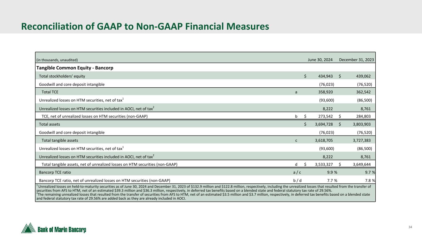 34 Text 95,96,96 Light Gray 232, 232, 232 Black 0, 0, 0 White 255, 255, 255 Accent 1 7,89,52 Accent 2 248,153,40 Accent 3 254,217,129 Accent 4 52,153,70 Accent 5 5,39,67 Accent 6 171,184,195 Reconciliation of GAAP to Non-GAAP Financial Measures (in thousands, unaudited) June 30, 2024 December 31, 2023 Tangible Common Equity - Bancorp Total stockholders' equity $ 434,943 $ 439,062 Goodwill and core deposit intangible (76,023) (76,520) Total TCE a 358,920 362,542 Unrealized losses on HTM securities, net of tax1 (93,600) (86,500) Unrealized losses on HTM securities included in AOCI, net of tax2 8,222 8,761 TCE, net of unrealized losses on HTM securities (non-GAAP) b $ 273,542 $ 284,803 Total assets $ 3,694,728 $ 3,803,903 Goodwill and core deposit intangible (76,023) (76,520) Total tangible assets c 3,618,705 3,727,383 Unrealized losses on HTM securities, net of tax1 (93,600) (86,500) Unrealized losses on HTM securities included in AOCI, net of tax2 8,222 8,761 Total tangible assets, net of unrealized losses on HTM securities (non-GAAP) d $ 3,533,327 $ 3,649,644 Bancorp TCE ratio a / c 9.9 % 9.7 % Bancorp TCE ratio, net of unrealized losses on HTM securities (non-GAAP) b / d 7.7 % 7.8 % 1 Unrealized losses on held-to-maturity securities as of June 30, 2024 and December 31, 2023 of $132.9 million and $122.8 million, respectively, including the unrealized losses that resulted from the transfer of securities from AFS to HTM, net of an estimated $39.3 million and $36.3 million, respectively, in deferred tax benefits based on a blended state and federal statutory tax rate of 29.56%. 2The remaining unrealized losses that resulted from the transfer of securities from AFS to HTM, net of an estimated $3.5 million and $3.7 million, respectively, in deferred tax benefits based on a blended state and federal statutory tax rate of 29.56% are added back as they are already included in AOCI.